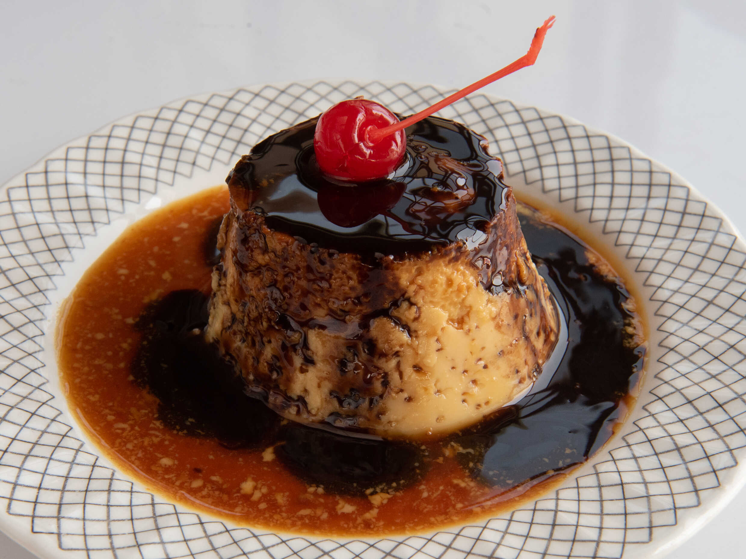 Delicioso flan casero con la receta de la casa, coronado con cereza, no te vas a arrepentir de pedirlo.