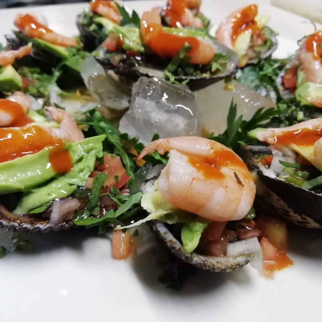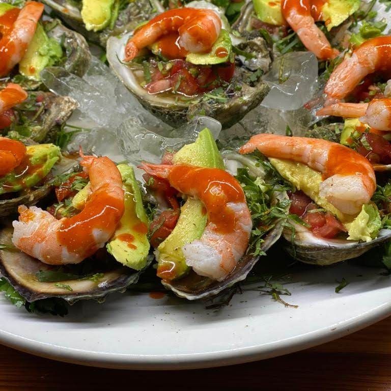 Deliciosos ostiones coronados, coronados con jitomate, cebolla, cilantro, camaron, aguacate, oregano, aceite de olivo y salsas negras de la casa, 12 pzas