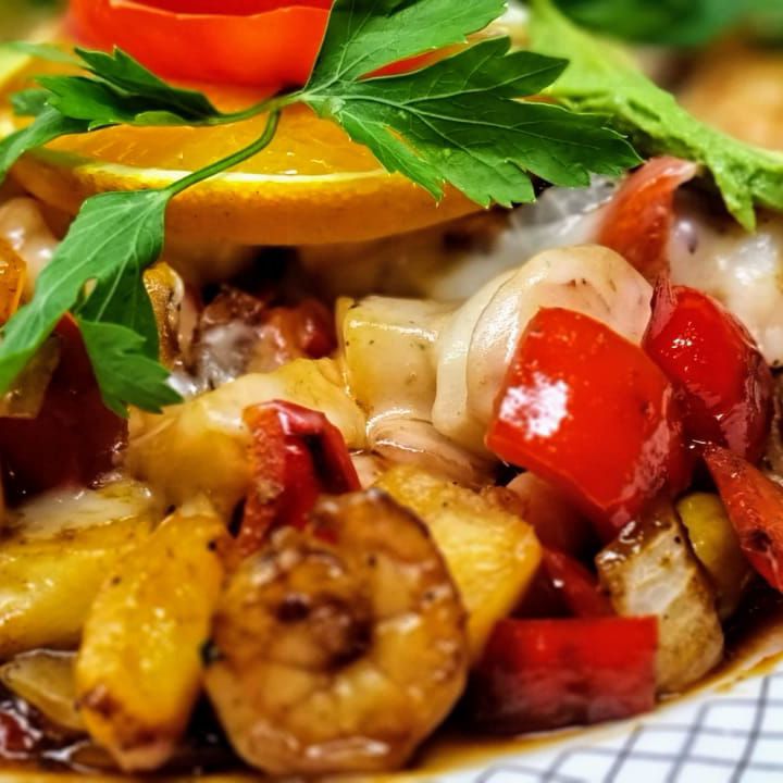 Delicioso camaron a la plancha acompañado de morron, cebolla, queso, y tocino, coronado con aguacate.
