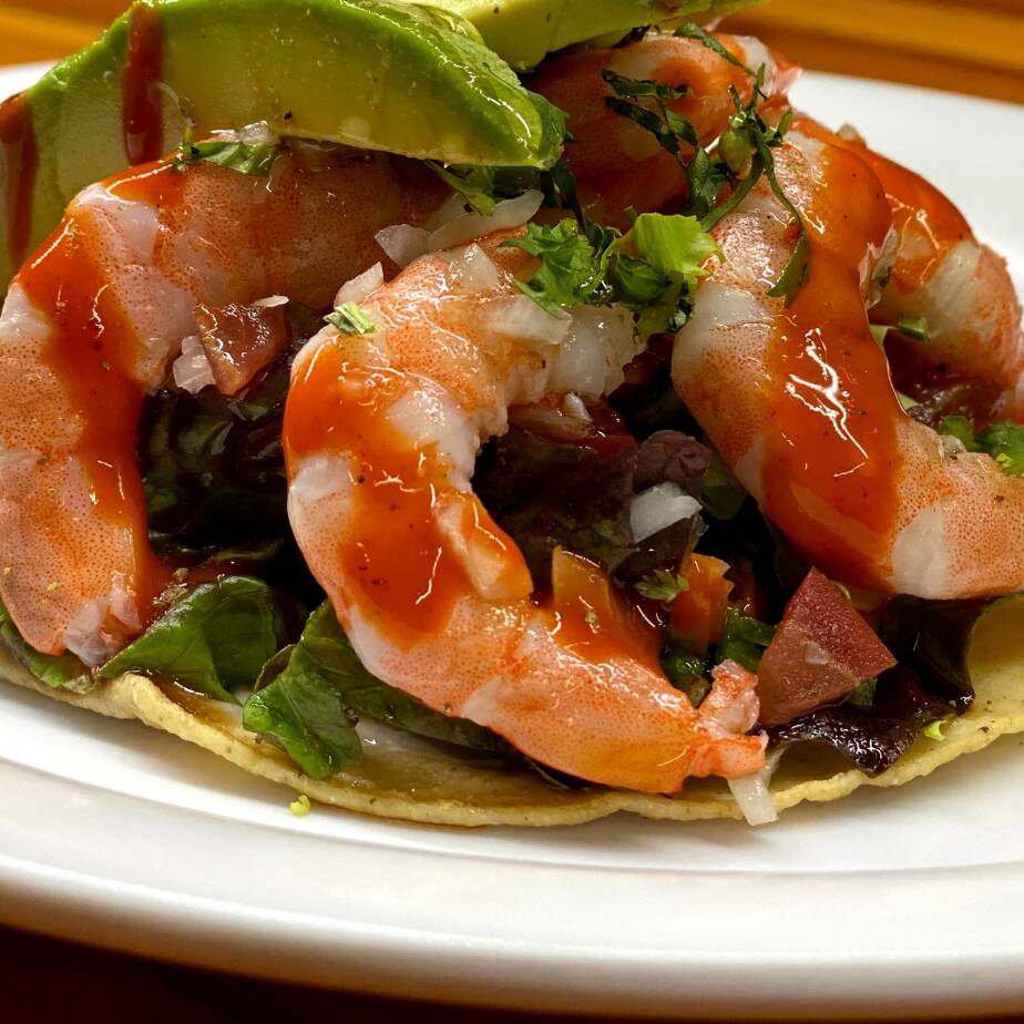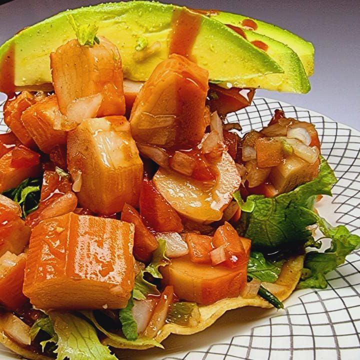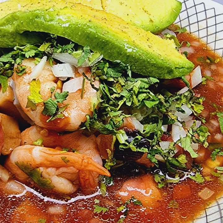 Deliciosa receta secreta de la casa, coronado con aguacate, cebolla, cilantro y aceite de olivo extra virgen, esocge tu marisco y el tamaño