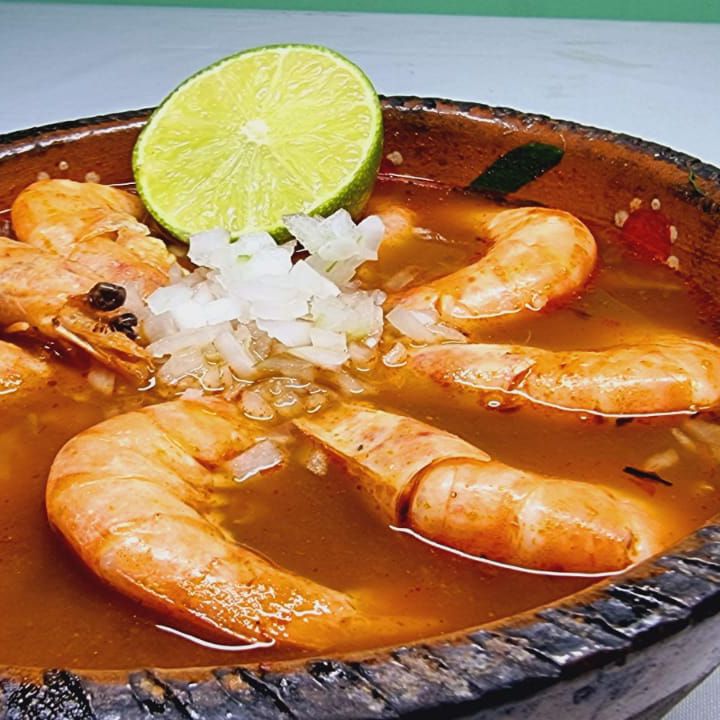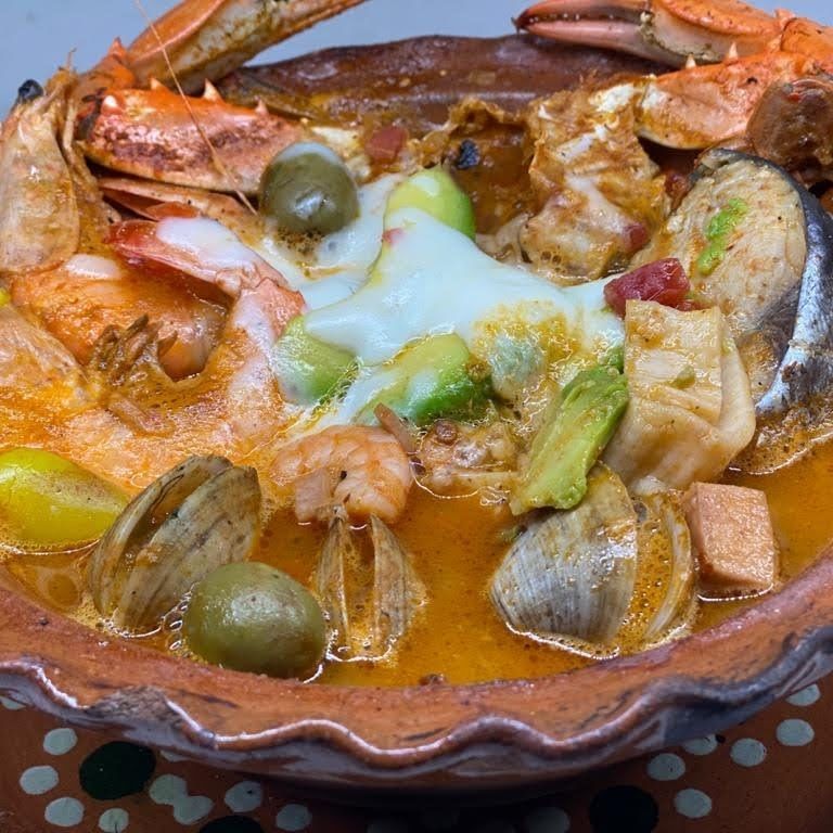 Delicioso caldo de la casa con, camaron, calamar, pulpo, surimi, ostion, pescado, almeja y jaiba coronada con aguacate y queso