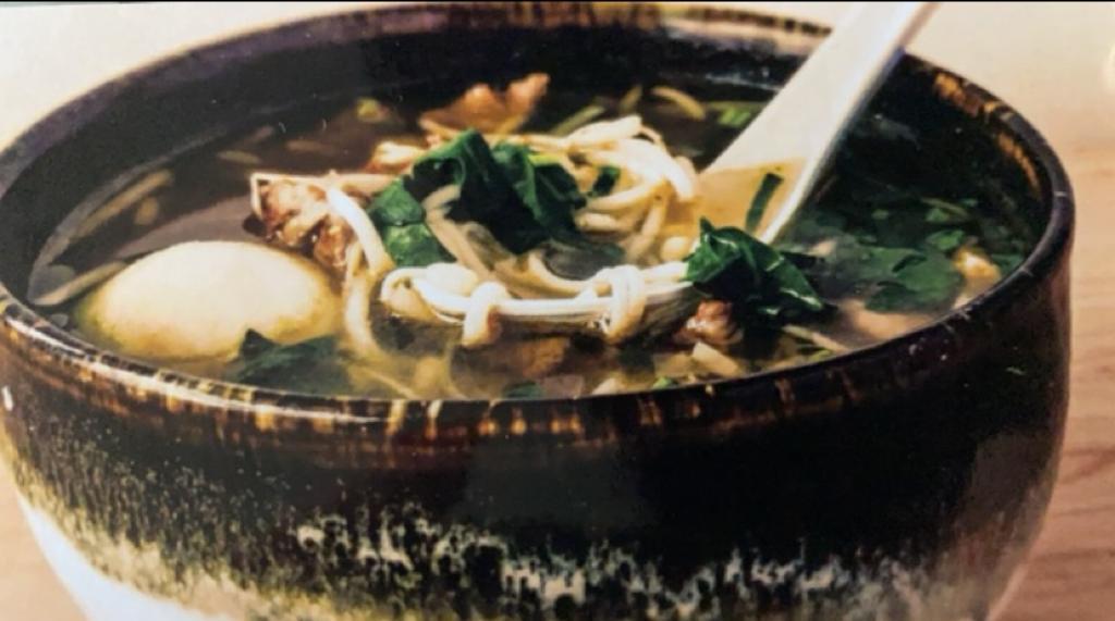Pasta de ramen con huevo hervido, carne de cerdo, germen de soya, chispitas de tempura y cebollín.