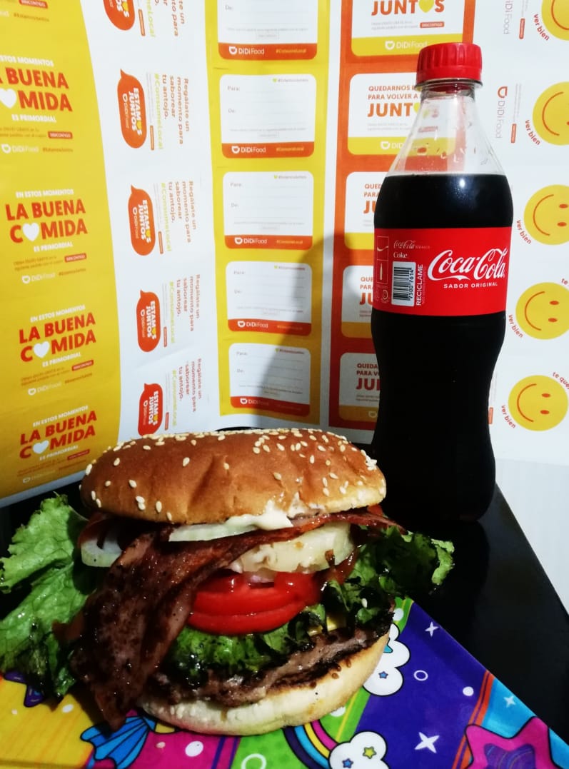 Hamburguesa con Queso y Piña,papas a la Francesa y coca de 600ml