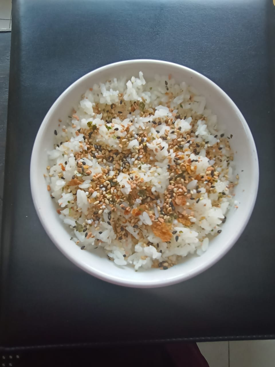 Arroz al vapor con condimento de salmón.