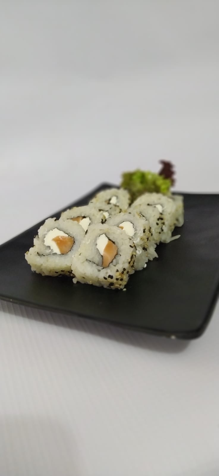 Salmón, aguacate, queso, pepino y por fuera mazago (hueva de pez)