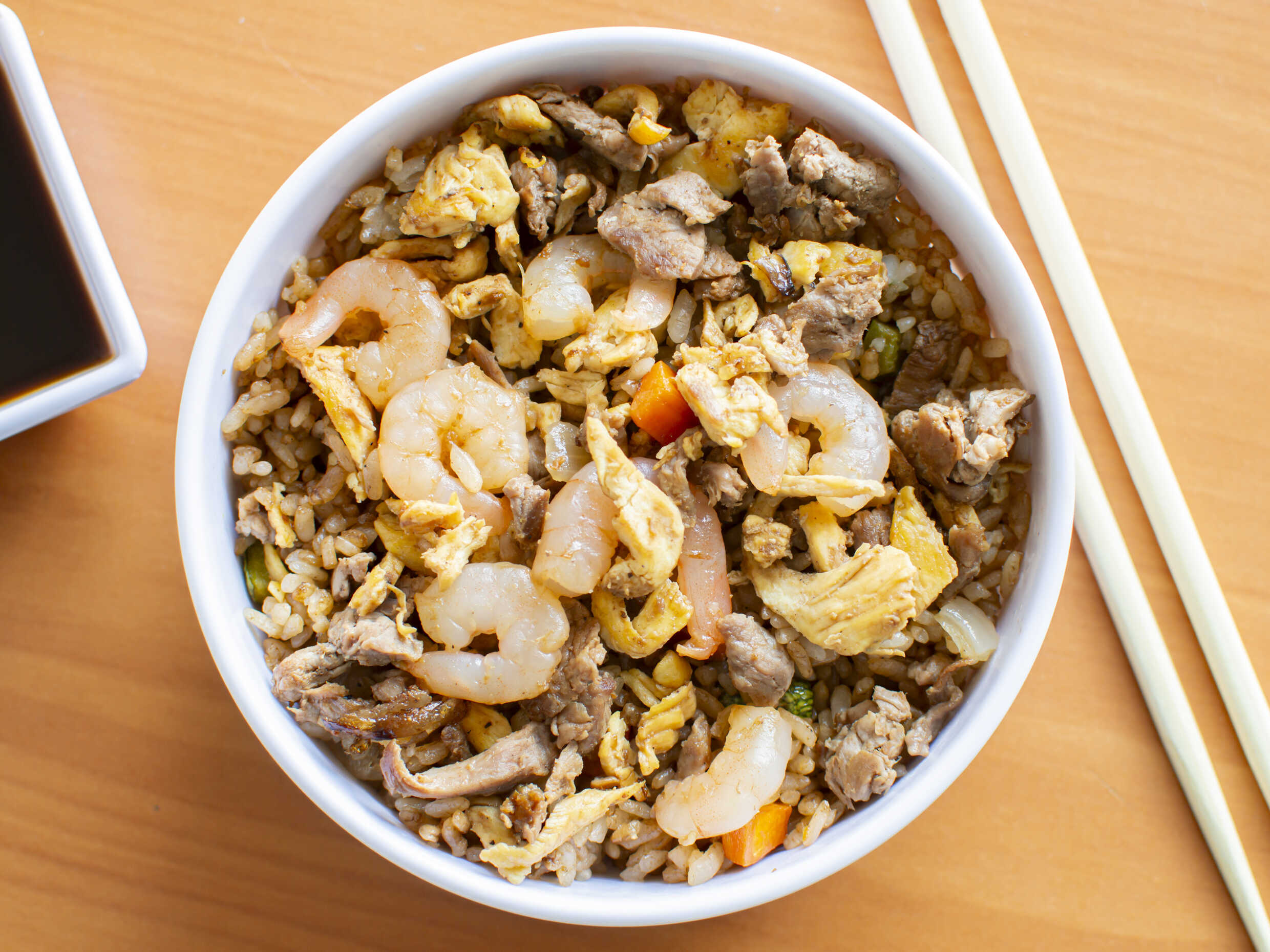 Arroz frito con pollo, filete y camarón.