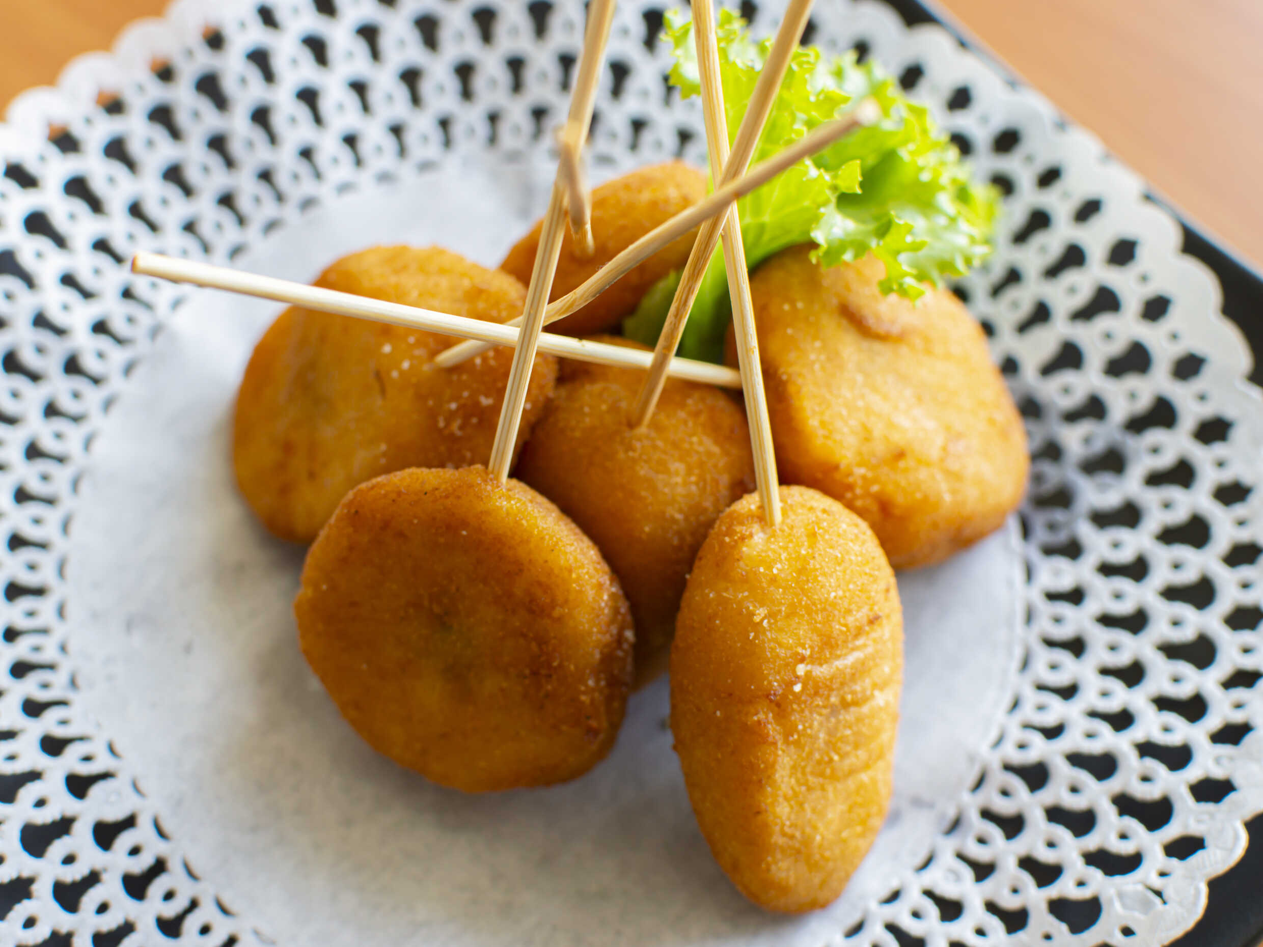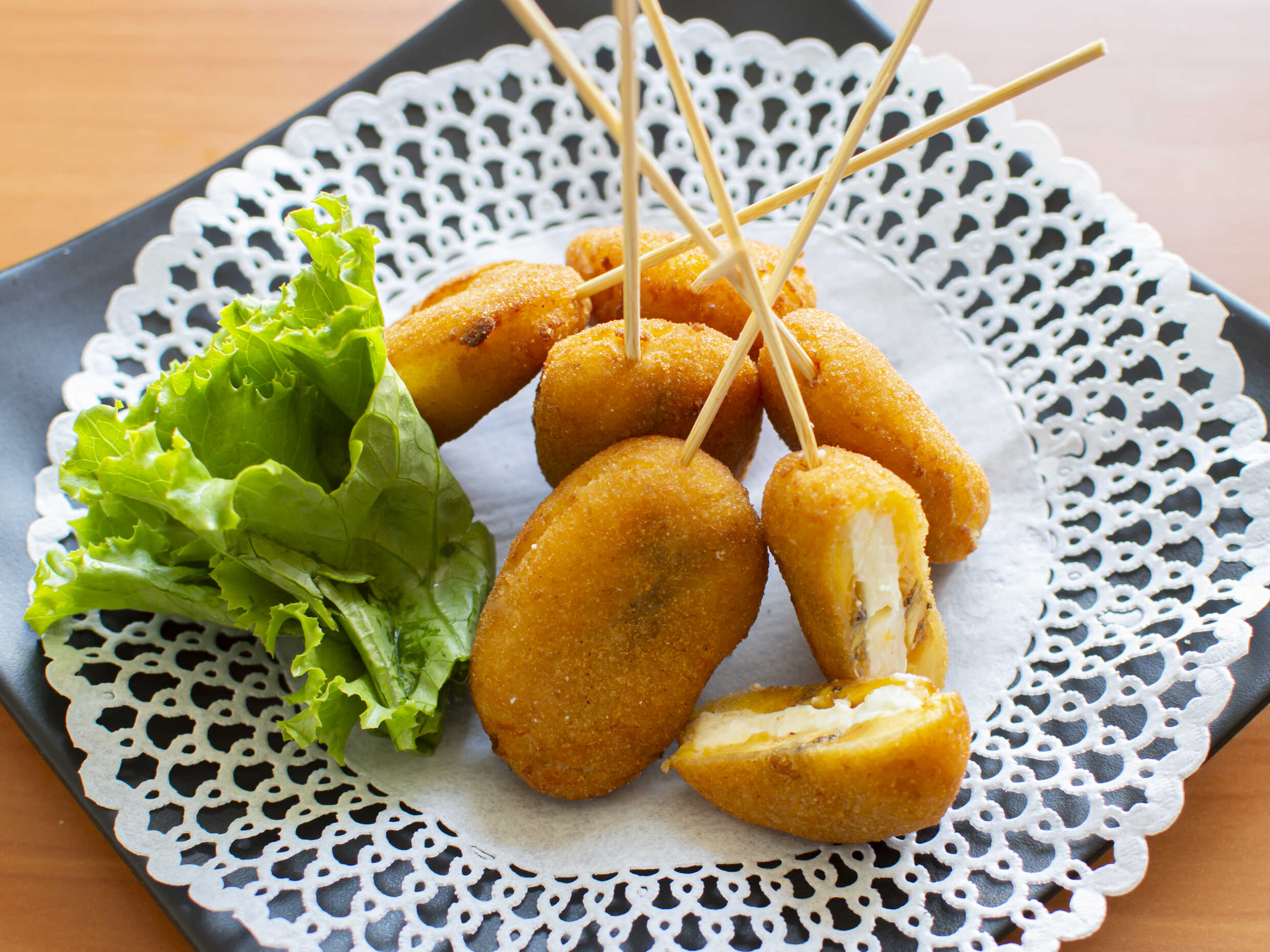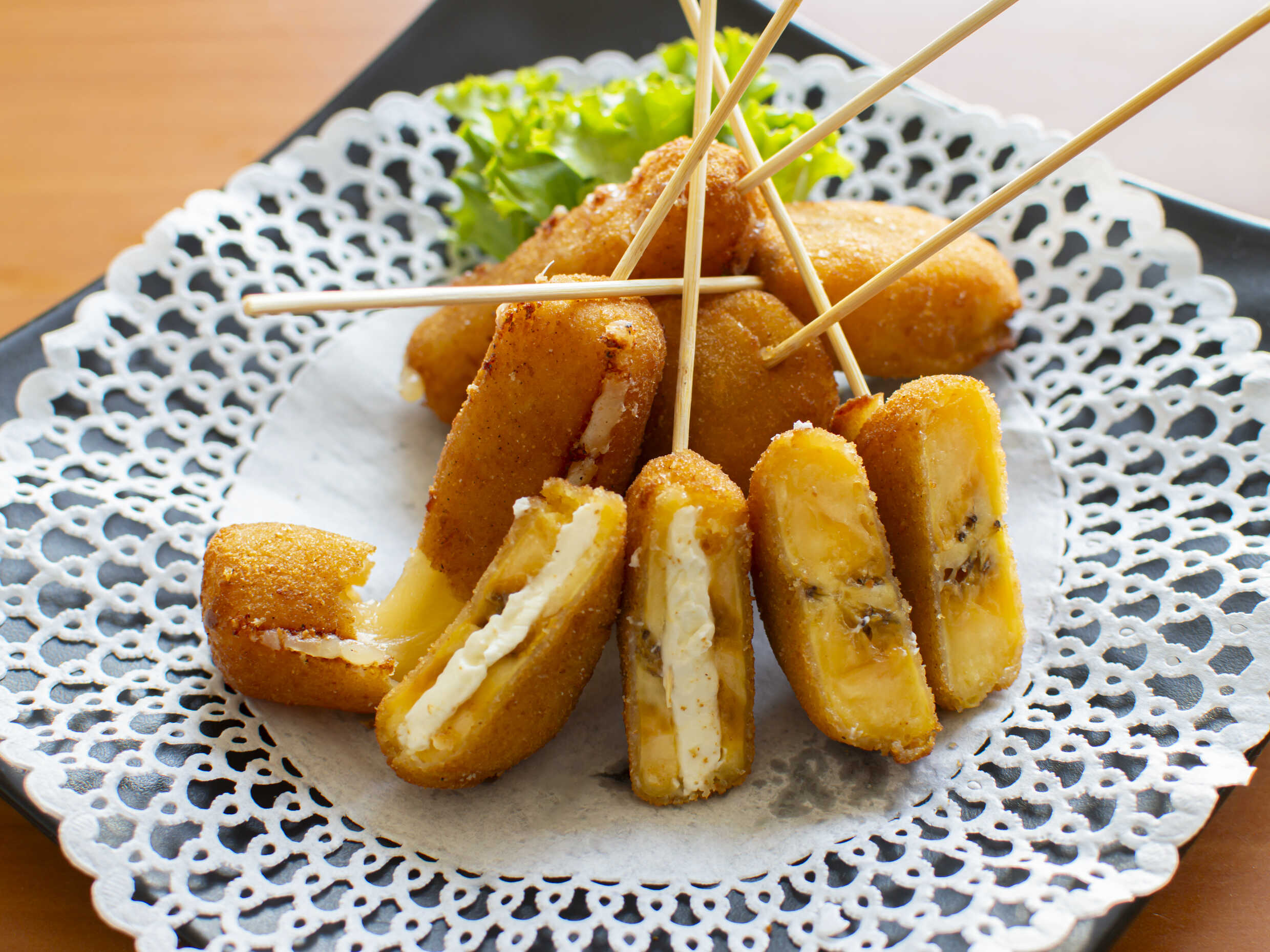 6 Piezas de brochetas de plátano rellenas de queso.