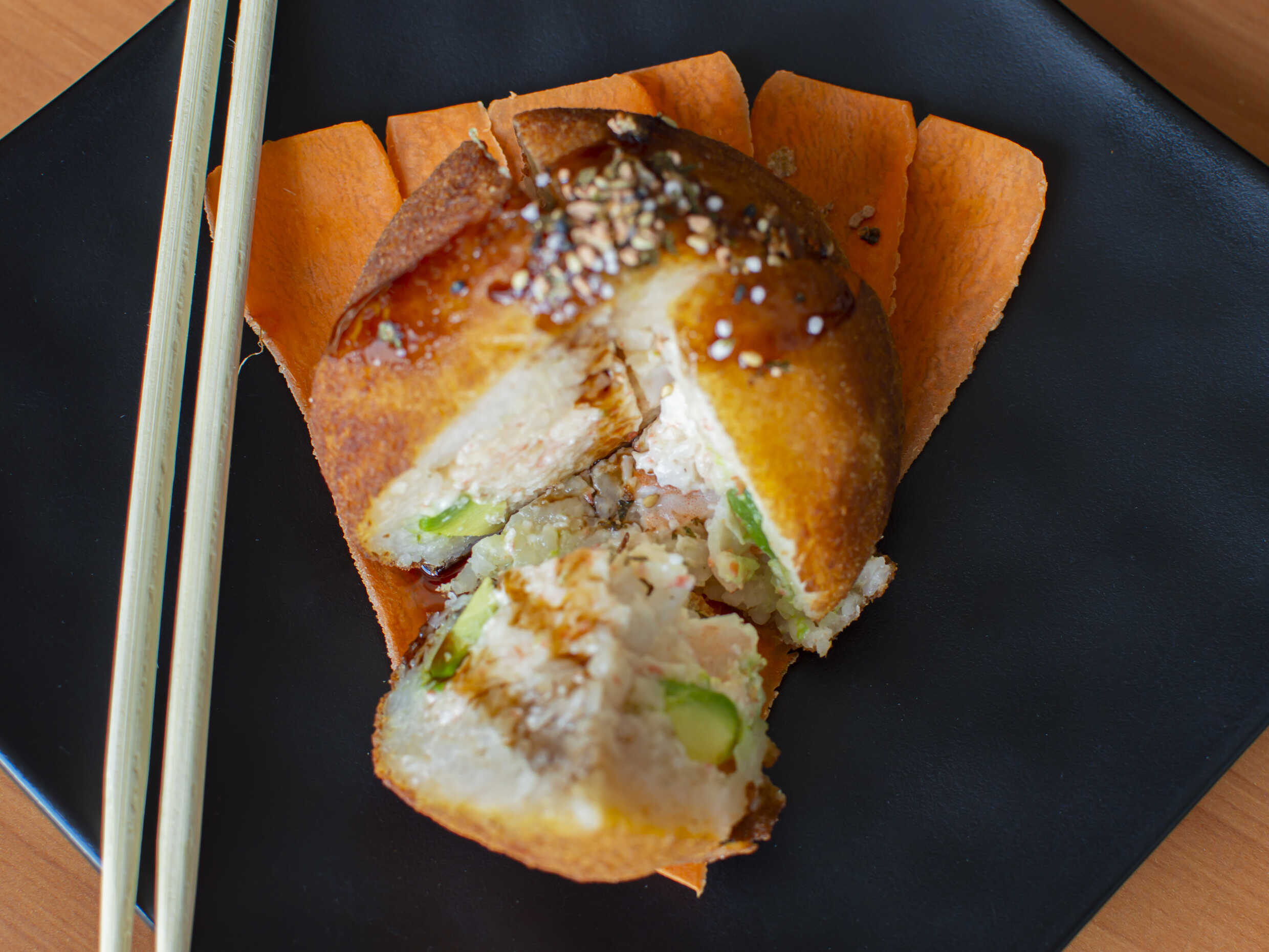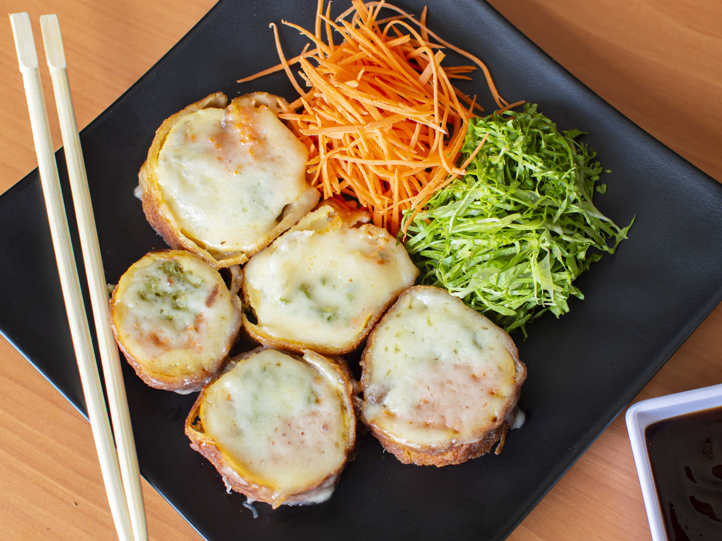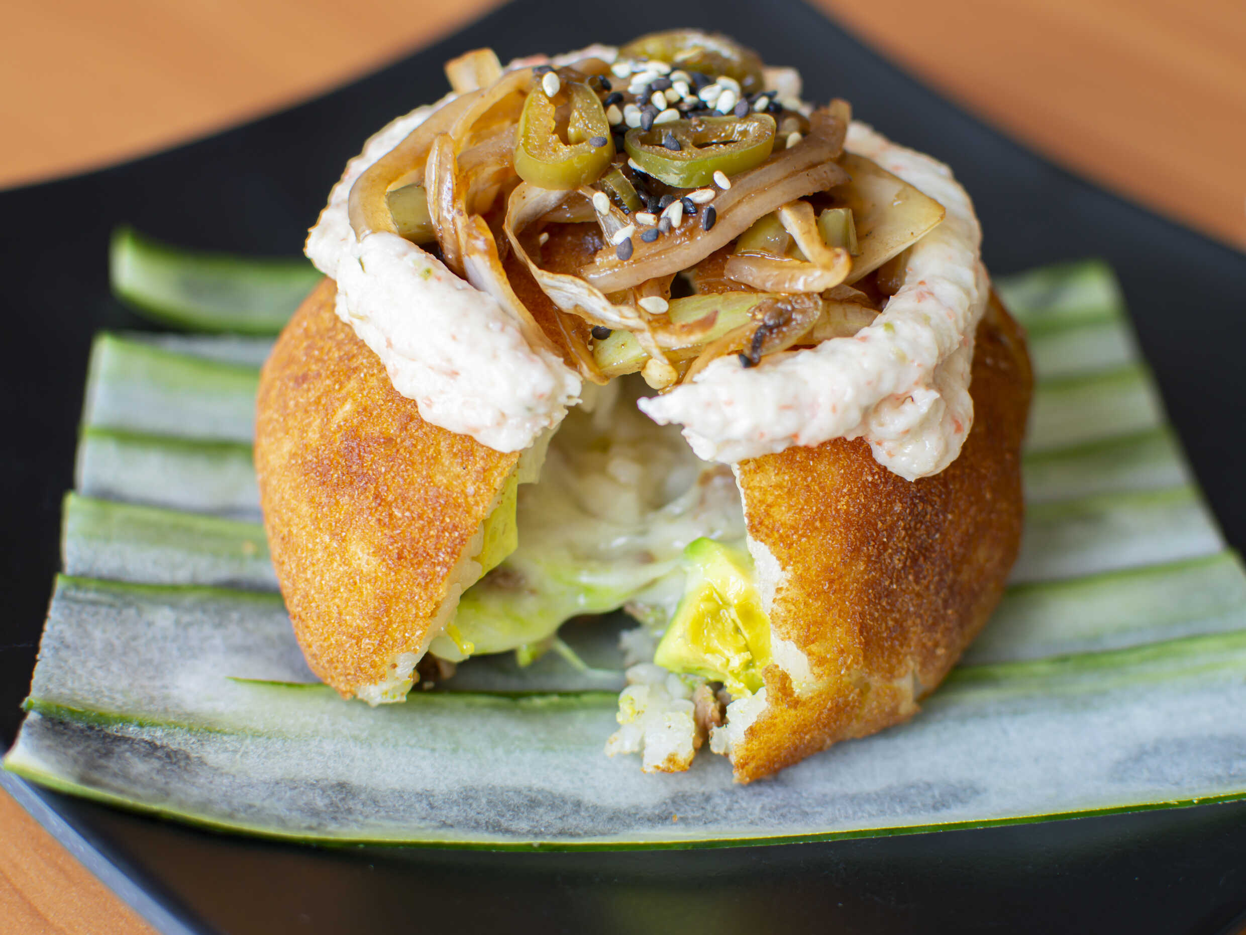 Surimi empanizado, cebollín, aguacate; por fuera queso manchego gratinado con chiles toreados.