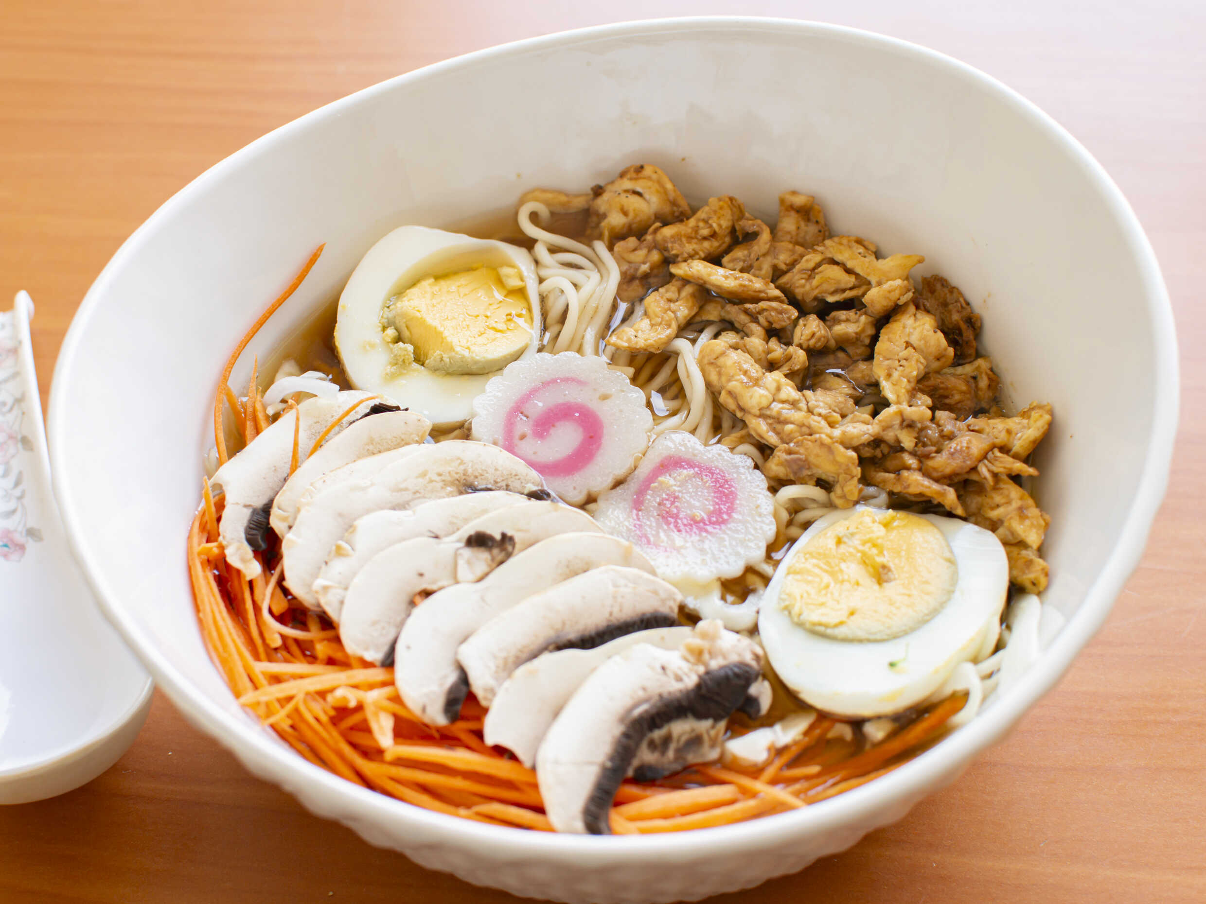 Pasta de ramen , filete de res, naruto, huevo hervido,col y champiñones.