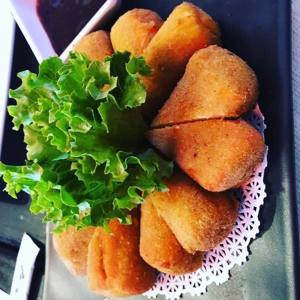 Bola de arroz empanizada rellena de camarón, aguacate y tampico.