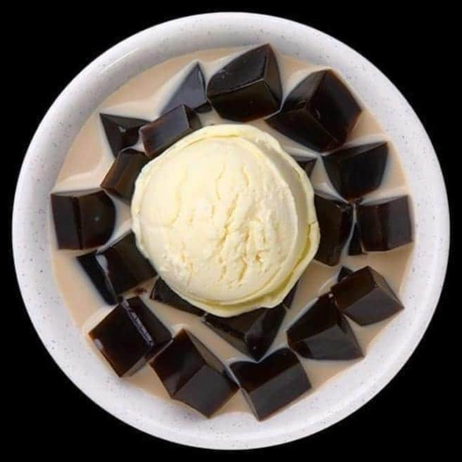 Gelatina de cafe con una bola de helado de vainilla cubierto de concentrado de kalua
