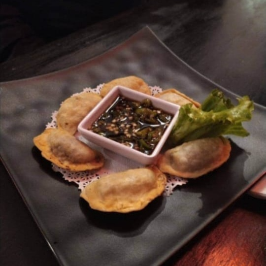 Platillo personal, 6 Piezas de brochetas empanizadas, con plátano macho, salsa agridulce