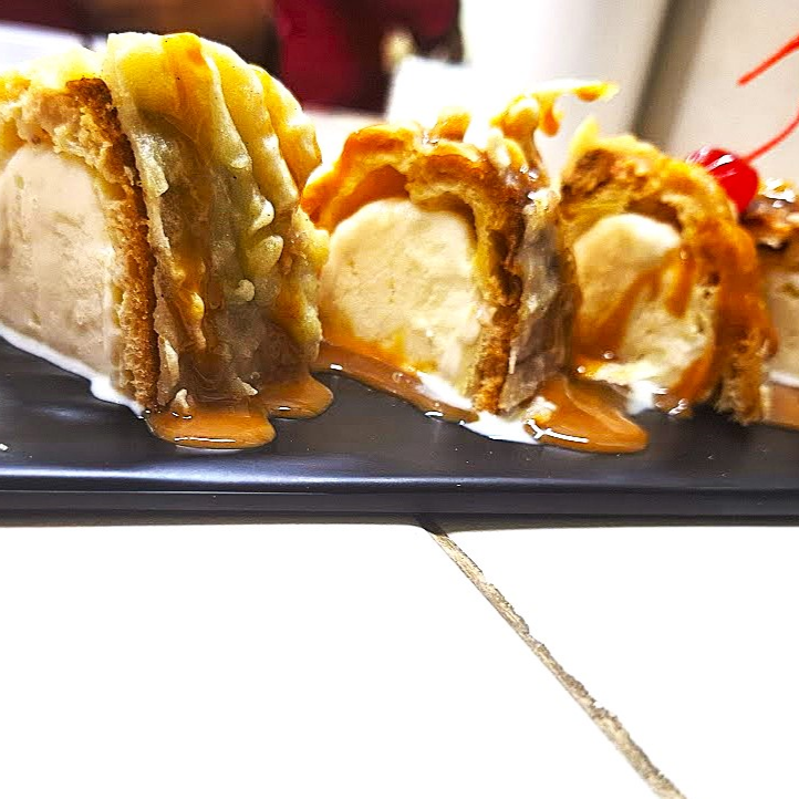 Rollo relleno de queso crema,por fuera plátano frito, helado sabor vainilla, cubierta, chocolate,fresao cajeta
