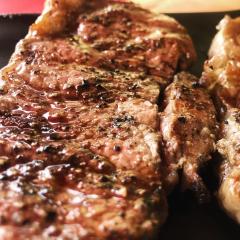 Kilo de bistec de Rib eye sazonado y en sus jugos con 5 guarniciones y dos salsas