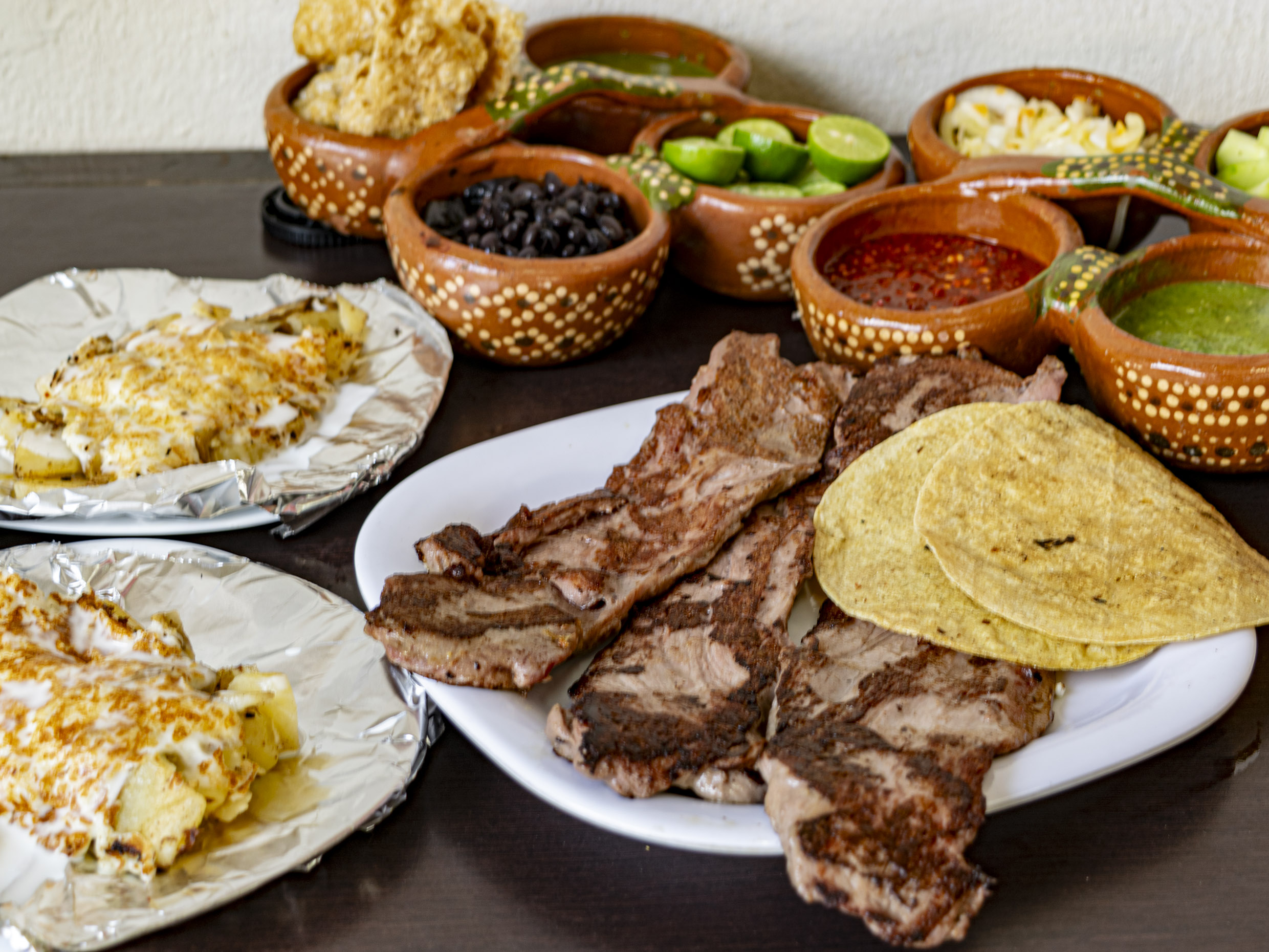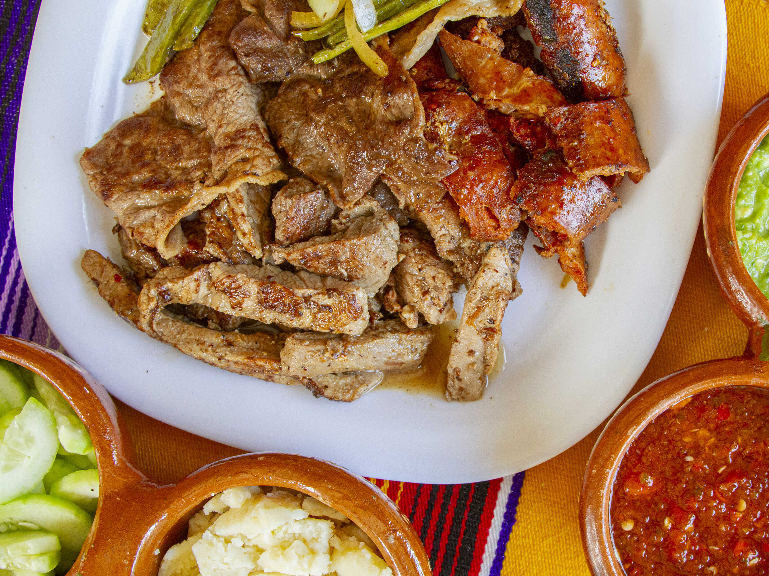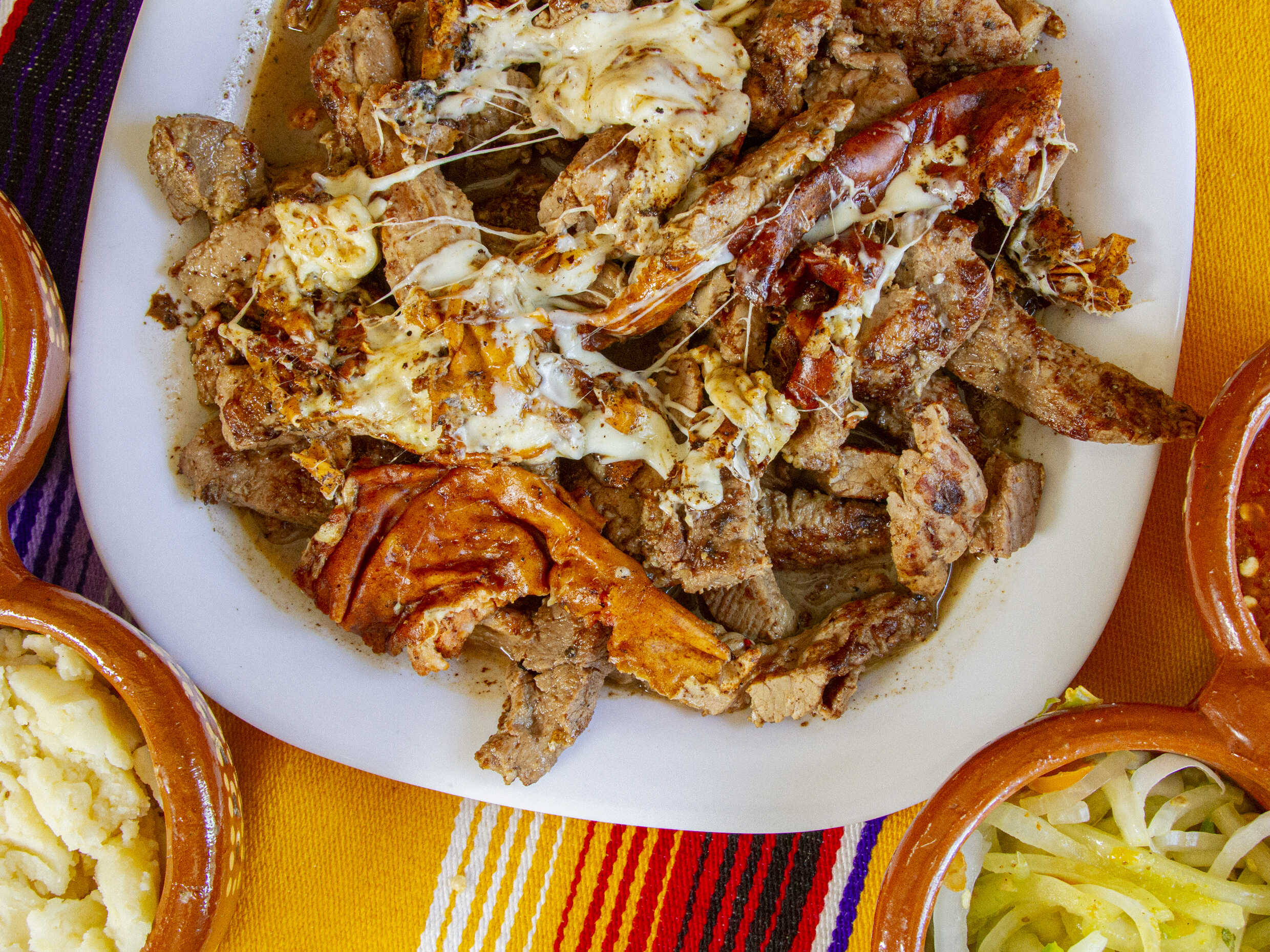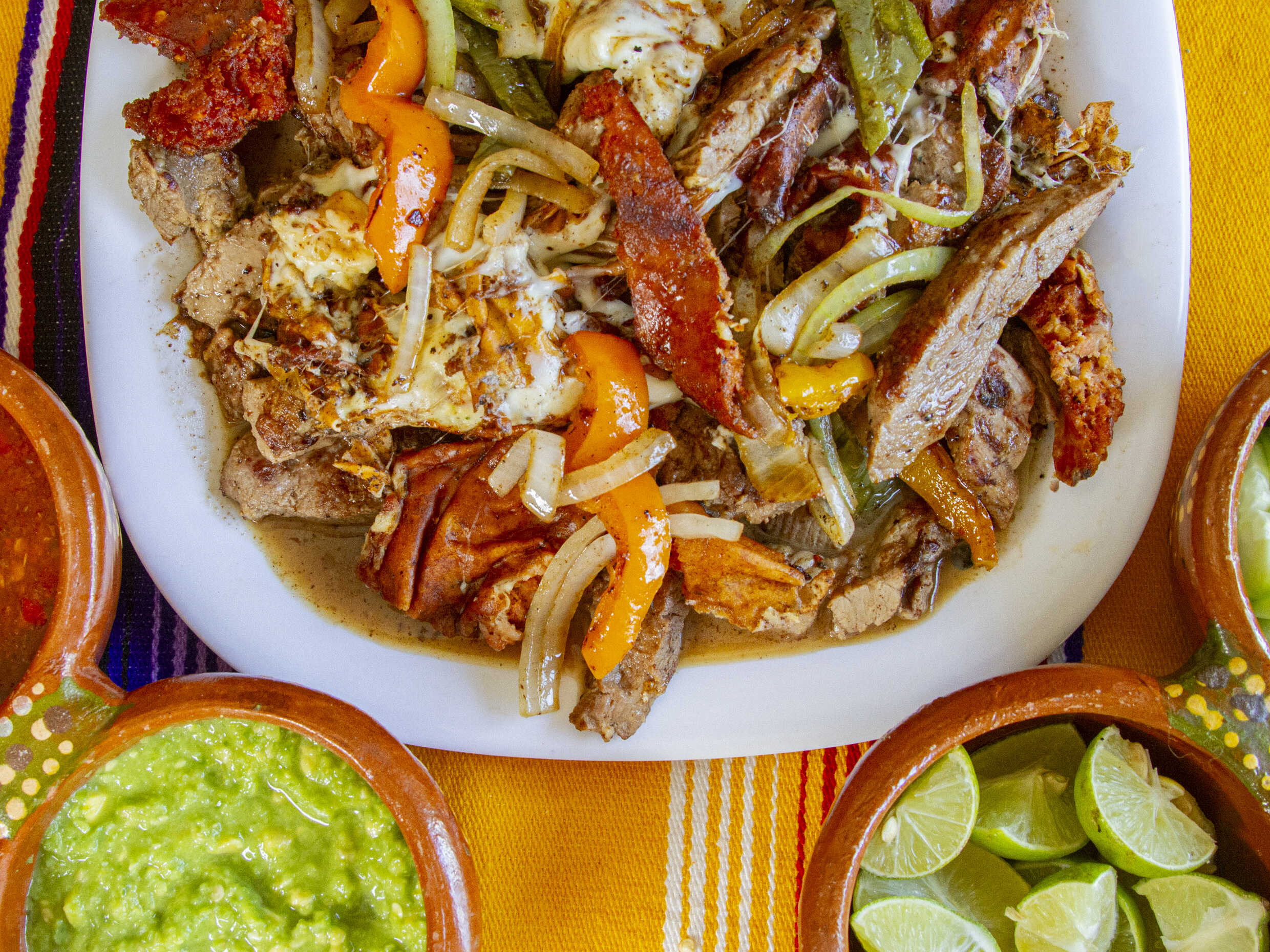 Bistec, queso oaxaca fundido y chorizo artesanal con queso fundido mas todos completos de la casa, tortillas,