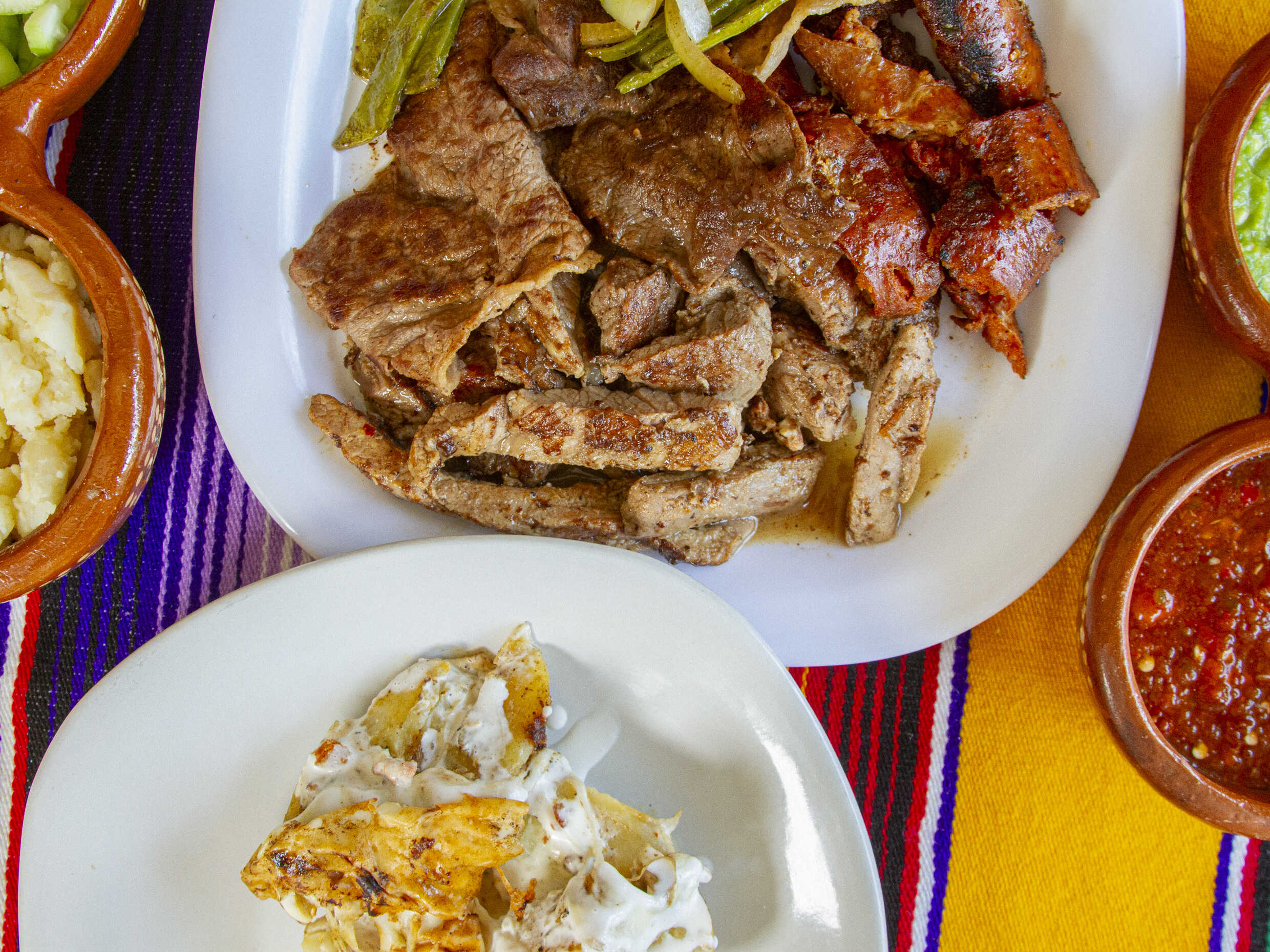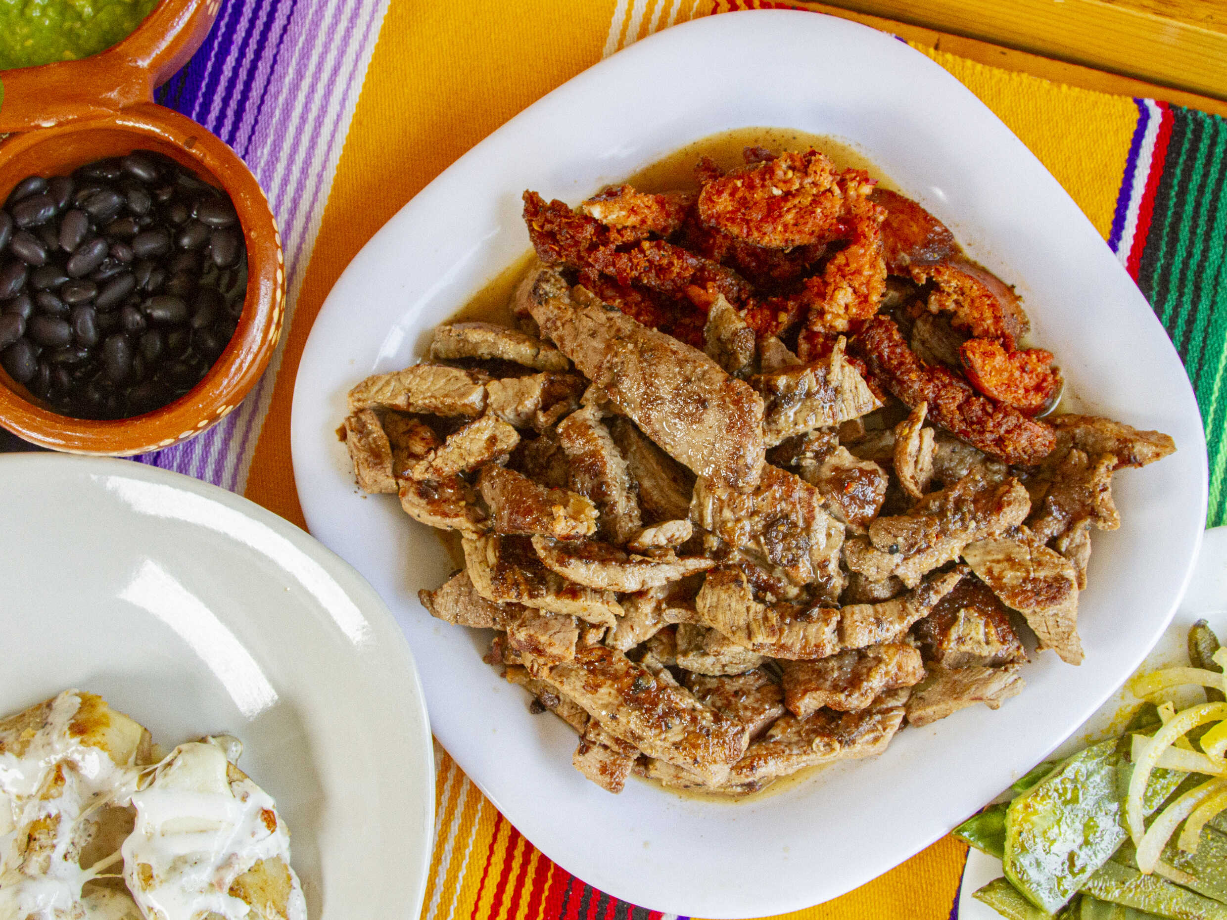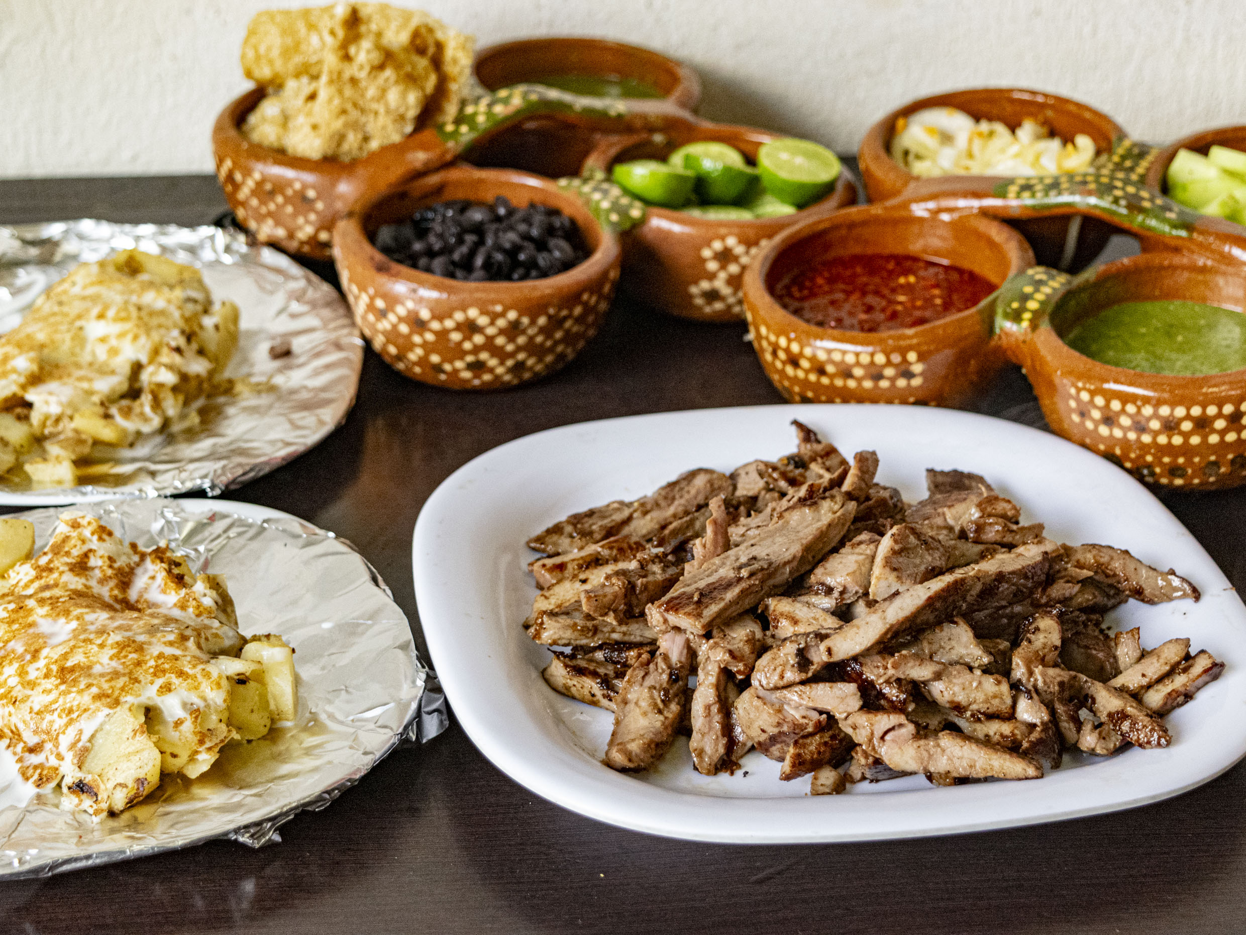 Bistec, queso oaxaca fundido y chorizo artesanal con queso fundido mas todos completos de la casa, tortillas,
