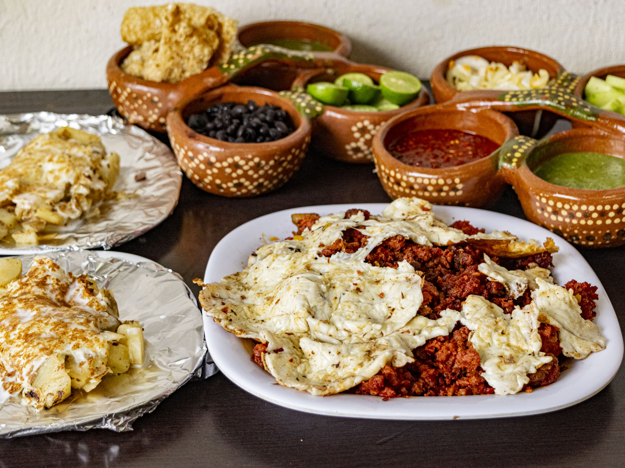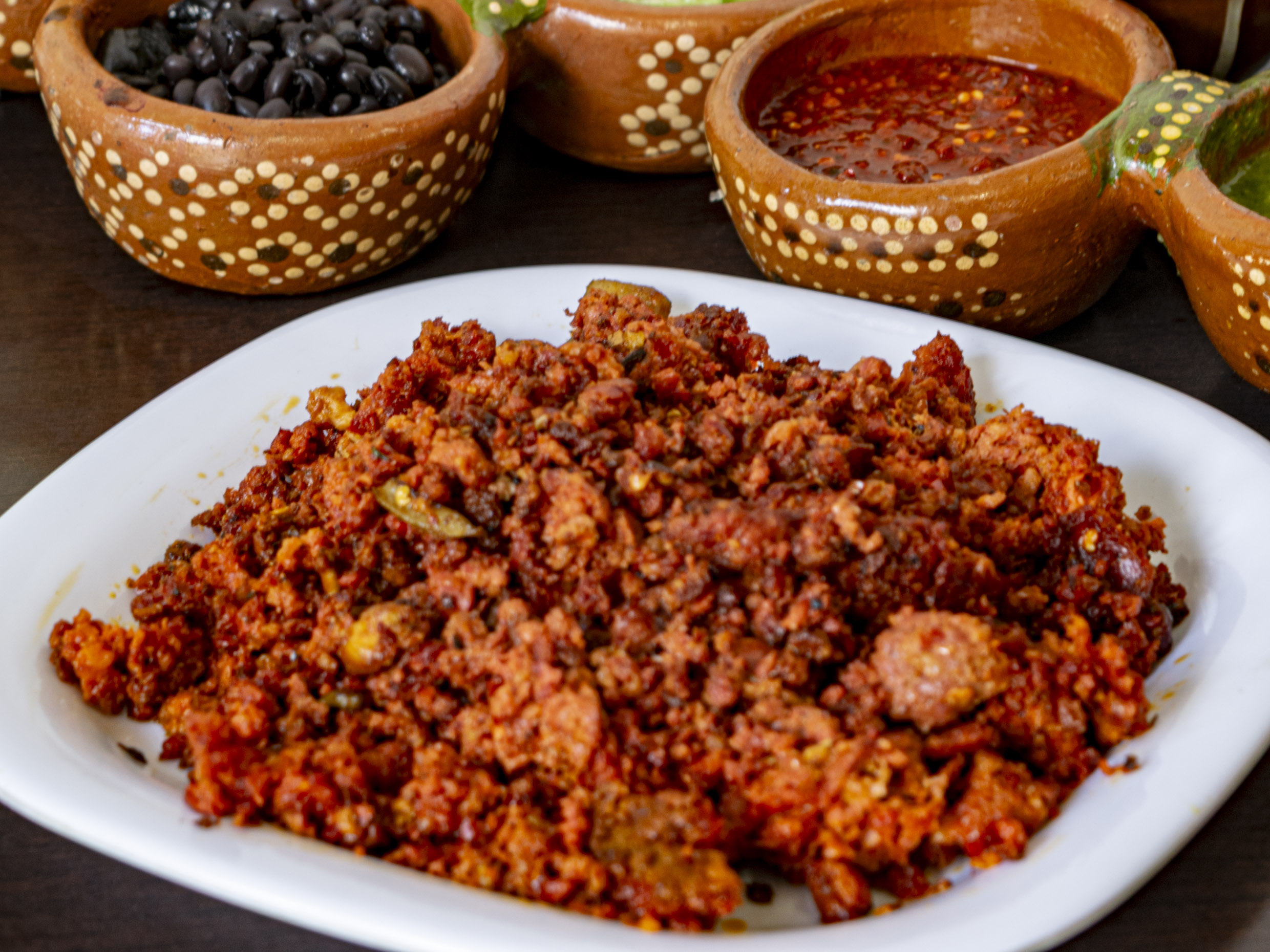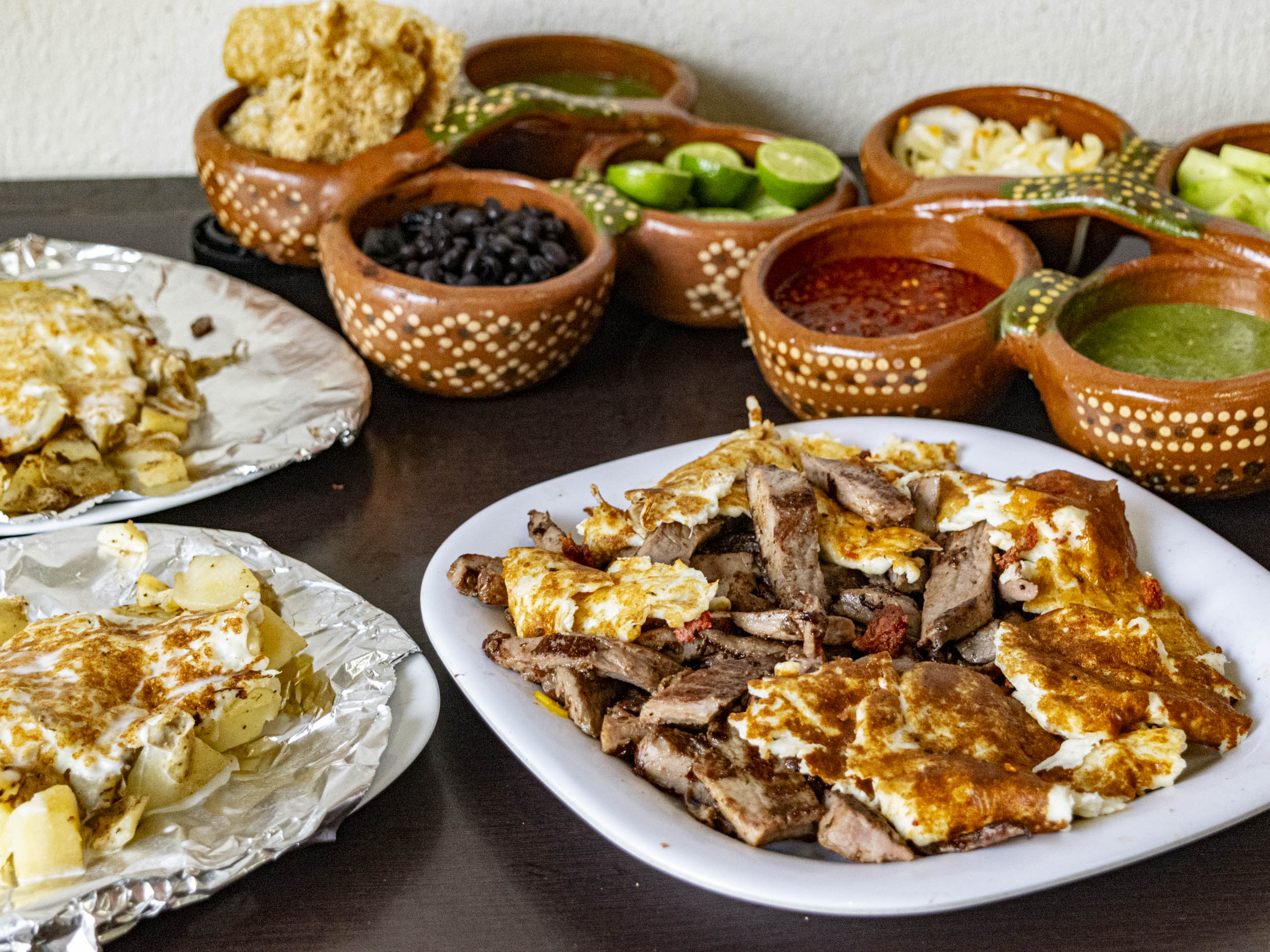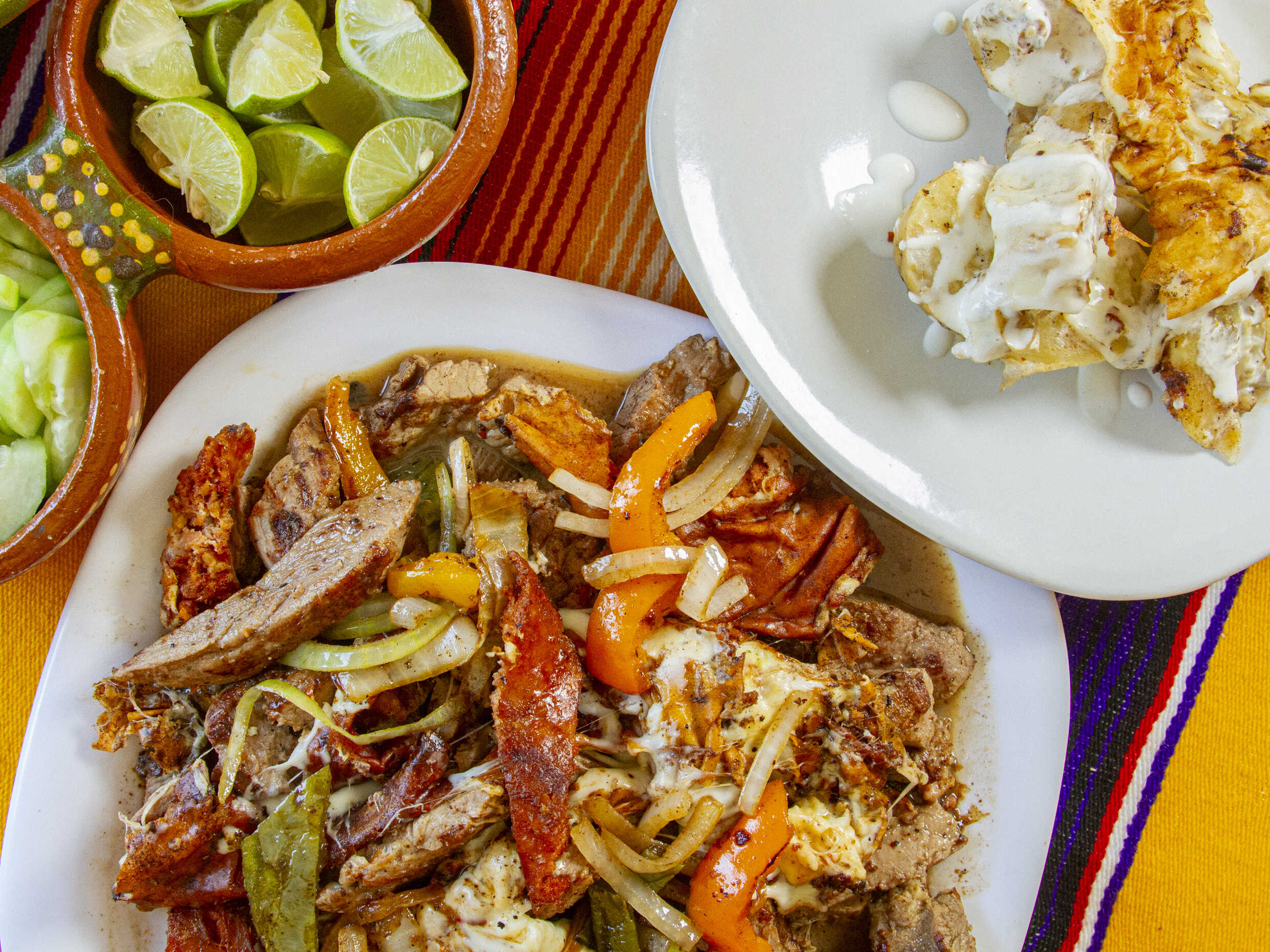 Bistec, queso oaxaca fundido y chorizo artesanal con queso fundido mas todos completos de la casa, tortillas,