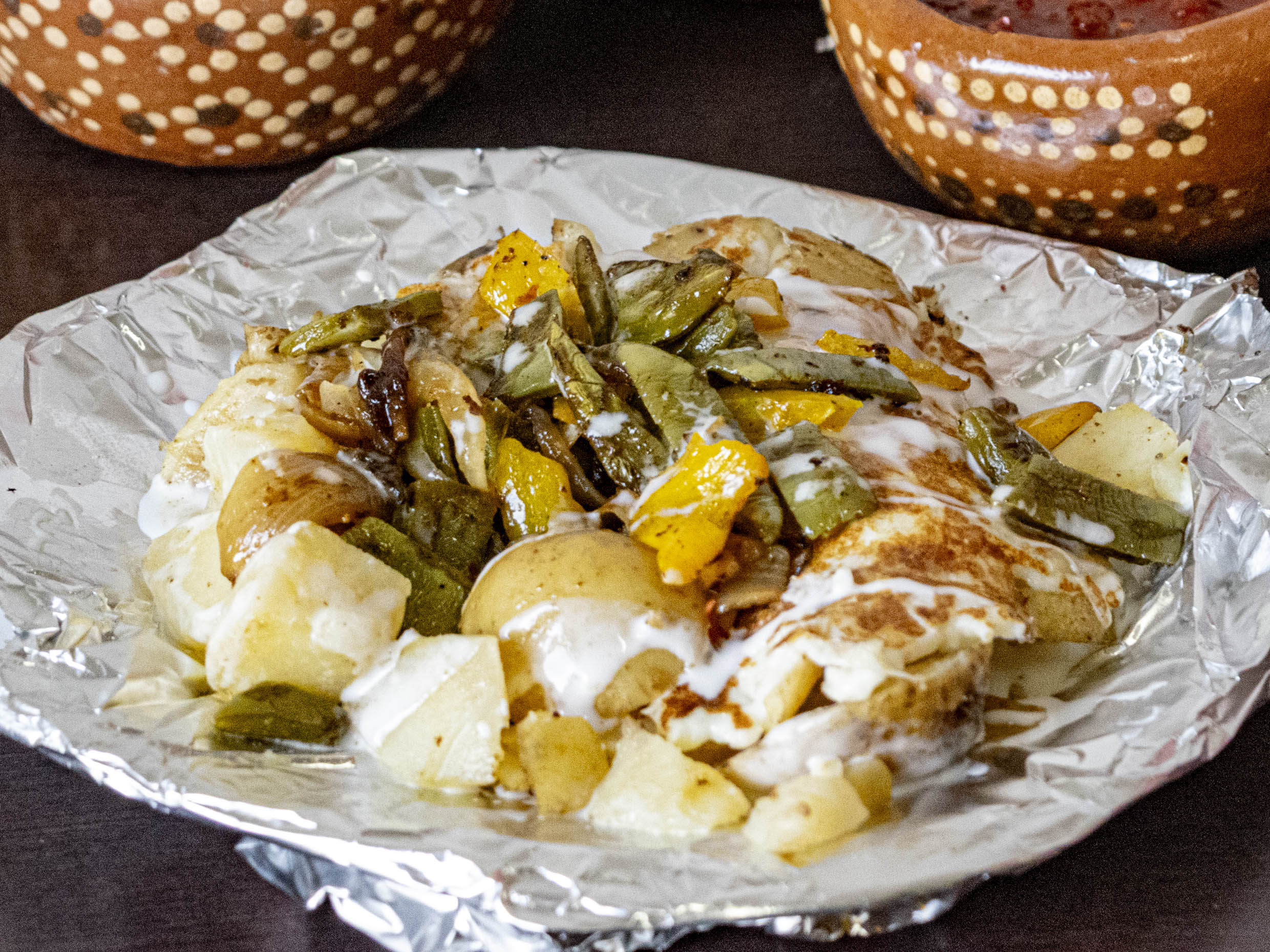 Incluye 2 papas sazonada a la mantequilla con queso fundido mas tortillas. Y todos los complementos de la casa.