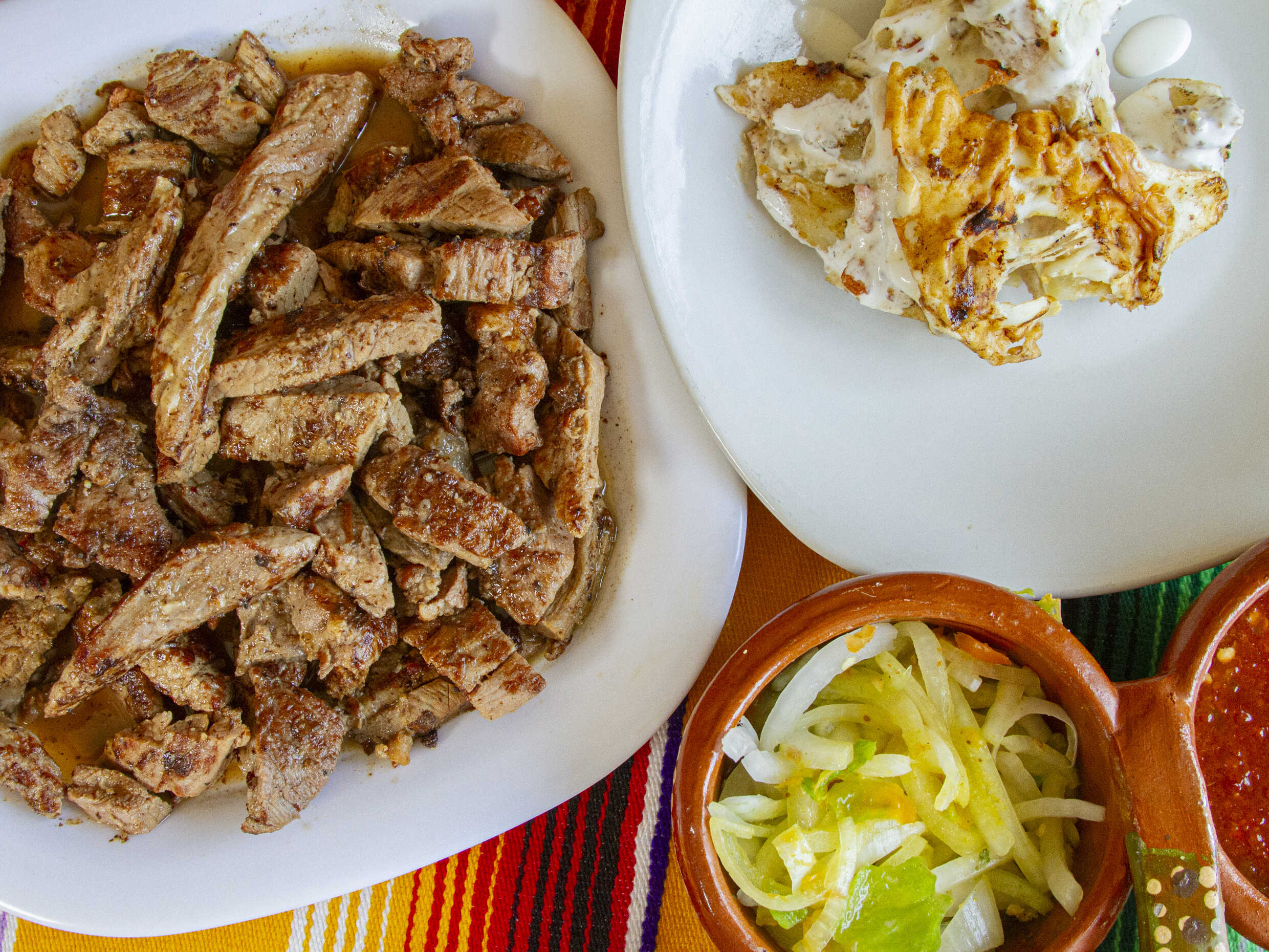 1/2 de Arrachera + 150 gChorizo una Papa al horno a la mantequilla + una orden nopales y cebollas