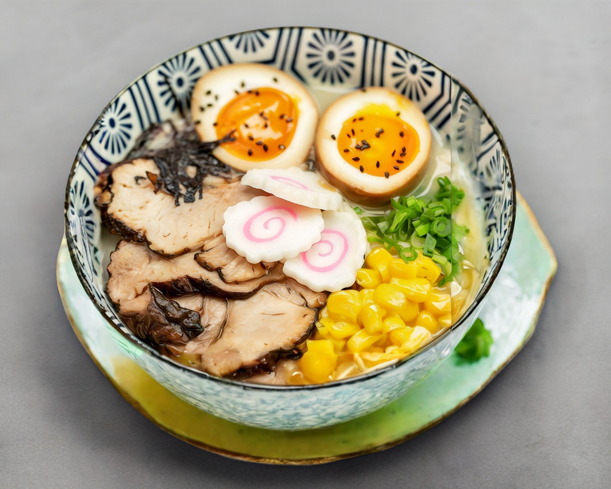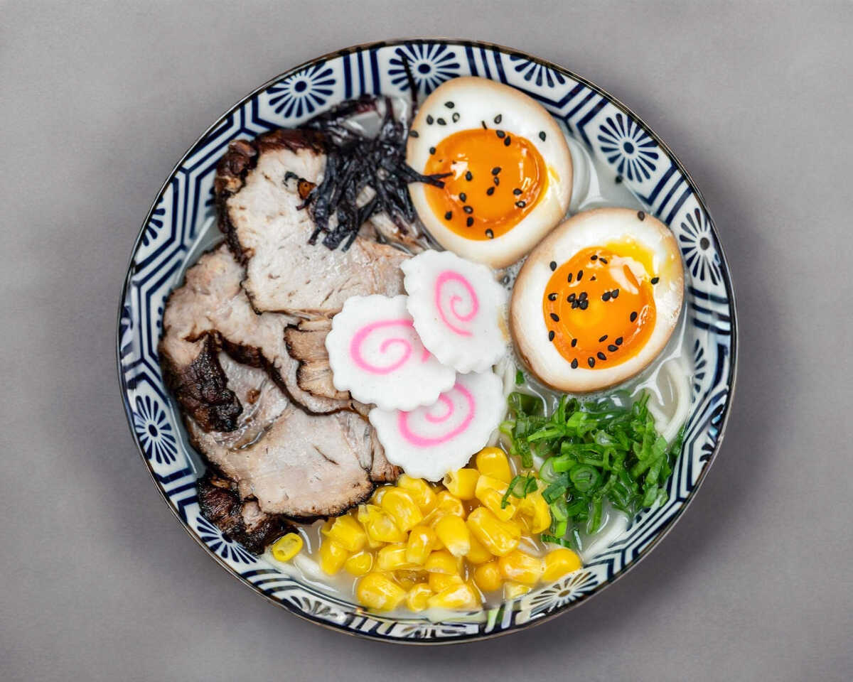 Fideos en un caldo cremoso y aterciopelado a base de pollo, con chashu, cebollín, elote y huevo marinado entero. Un ramen suave y lleno de sabor.