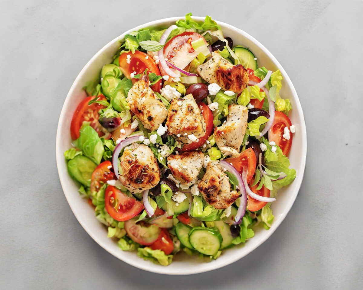 Mezcla de lechugas acompañada de pollo picosito, rebanadas de fresa, cacahuate tostado, calabaza y zanahoria capeada y crotones. Acompañado del aderezo de nuestra selección a tu gusto.