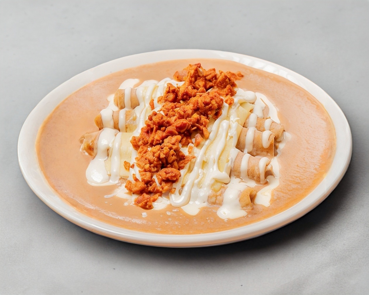 Tortillas rellenas de pollo bañadas en salsa cremosa verde o roja con crema y gratinadas con queso. Suaves y llenas de sabor, una opción deliciosa de la cocina mexicana. 4 pzas.