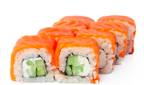 Queso crema , camarón y aguacate y pepino, por dentro , bañado en salsa chipotle