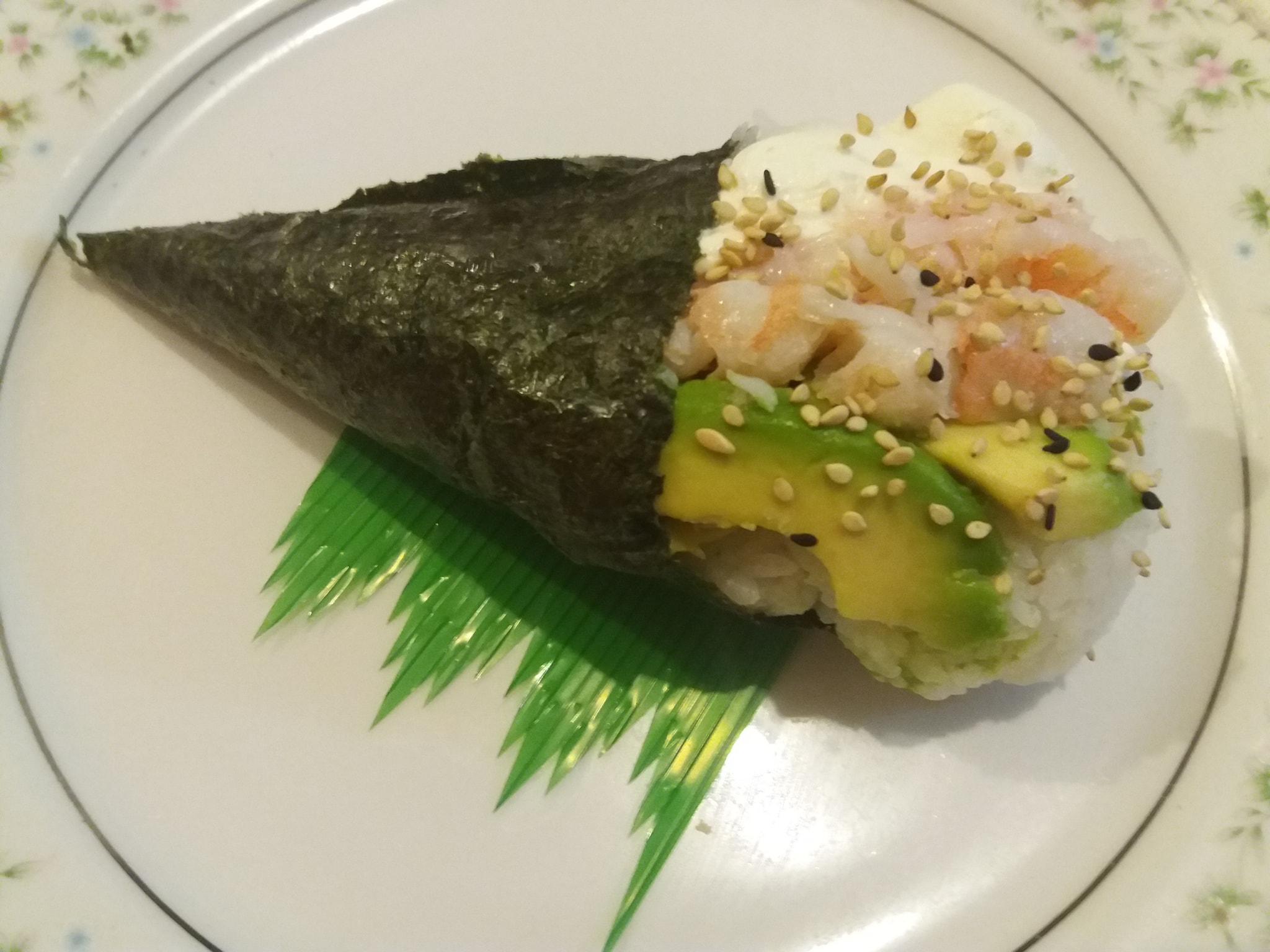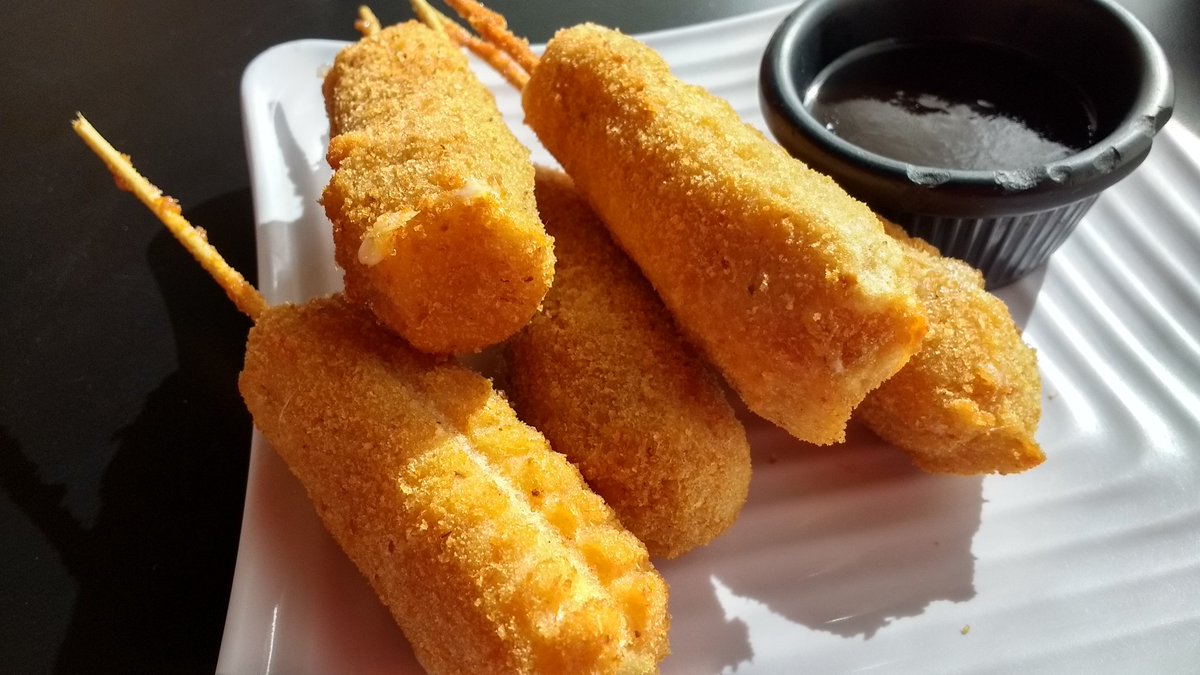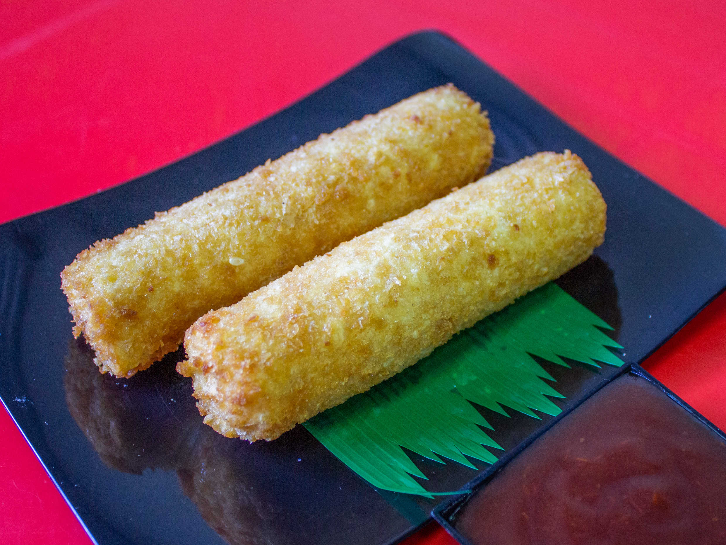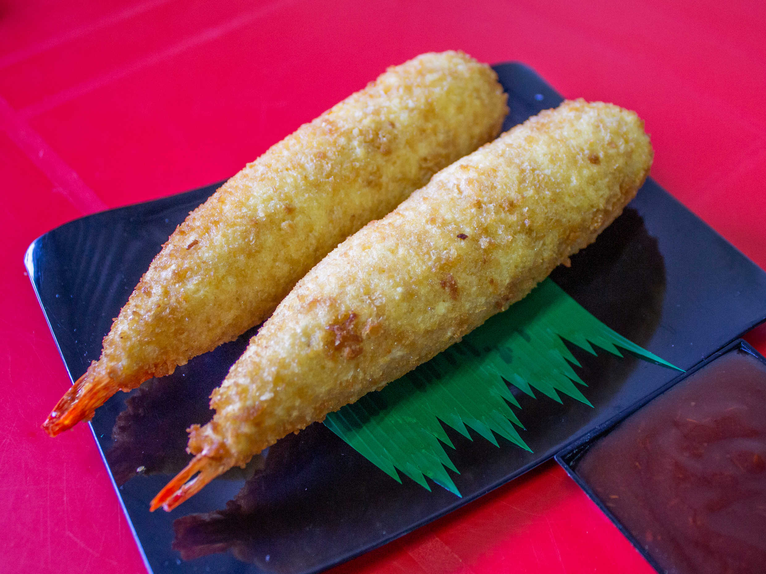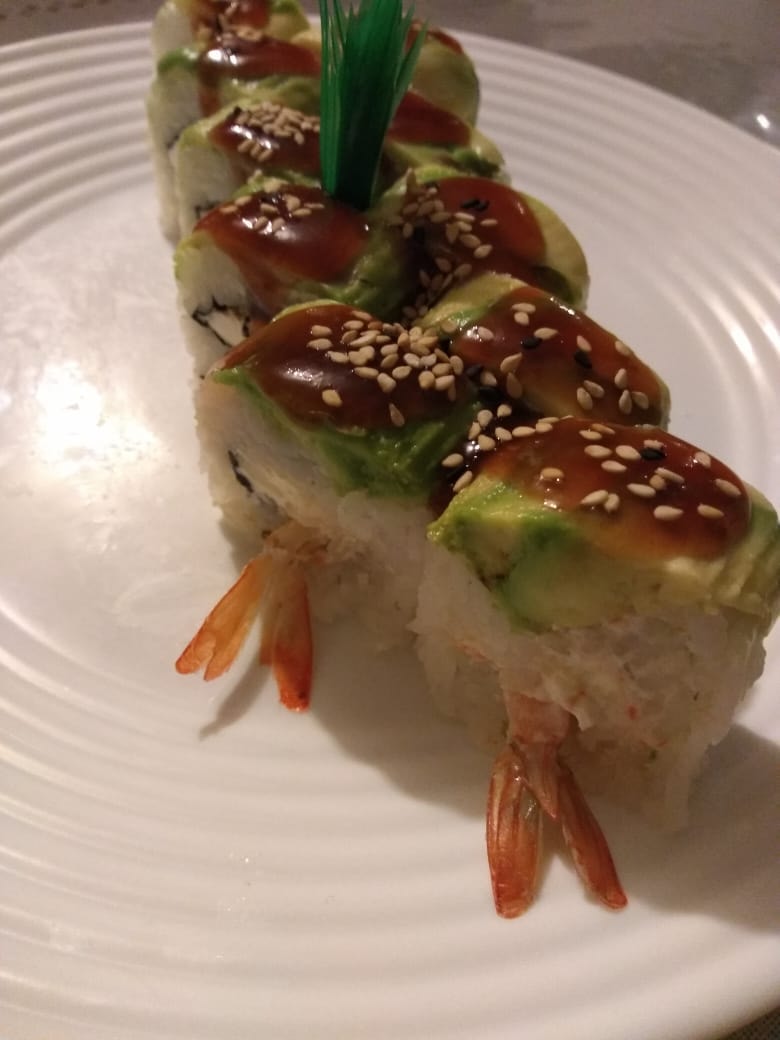 Mango por fuera, camarón empanizado, aguacate y queso crema por dentro, bañado en salsa dulce.