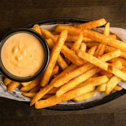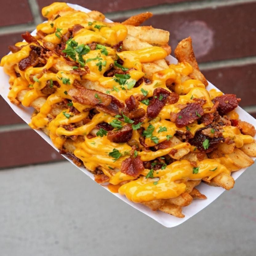 Papas ala francesa ,bañadas con queso amariilo y tocino