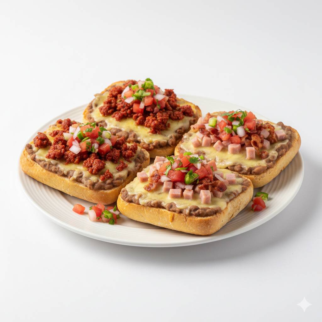 4 Molletes combinados con chorizo, jamon y tocino, acompañados de salsa pico de gallo.