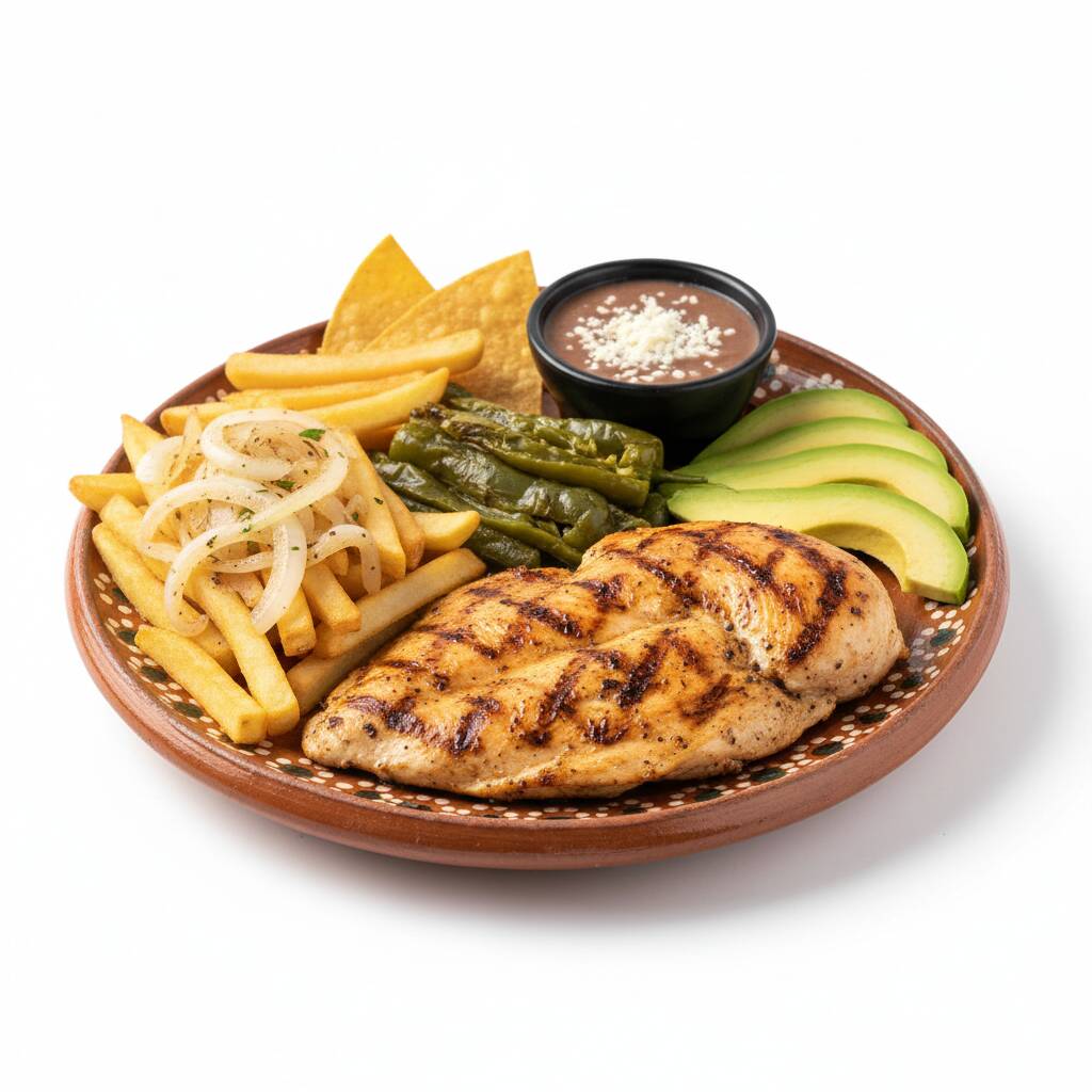 Jugosa pechuga de pollo a la plancha (100g), acompañada de papas fritas con cebolla asada, rajas de poblano, frijoles refritos con totopos y rebanadas de aguacate fresco. Un plato completo y balanceado.