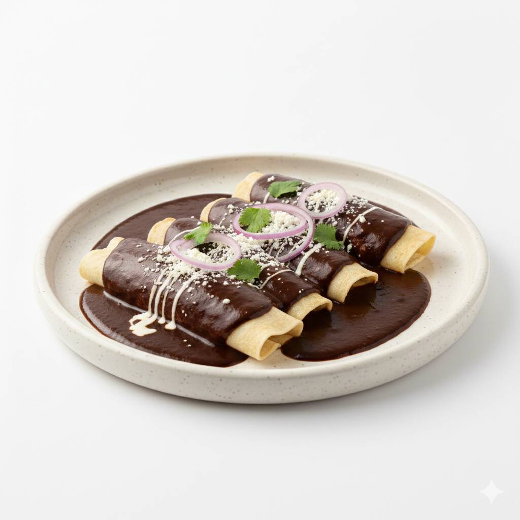 Tortillas de maíz rellenas a tu elección bañadas en mole rojo o verde