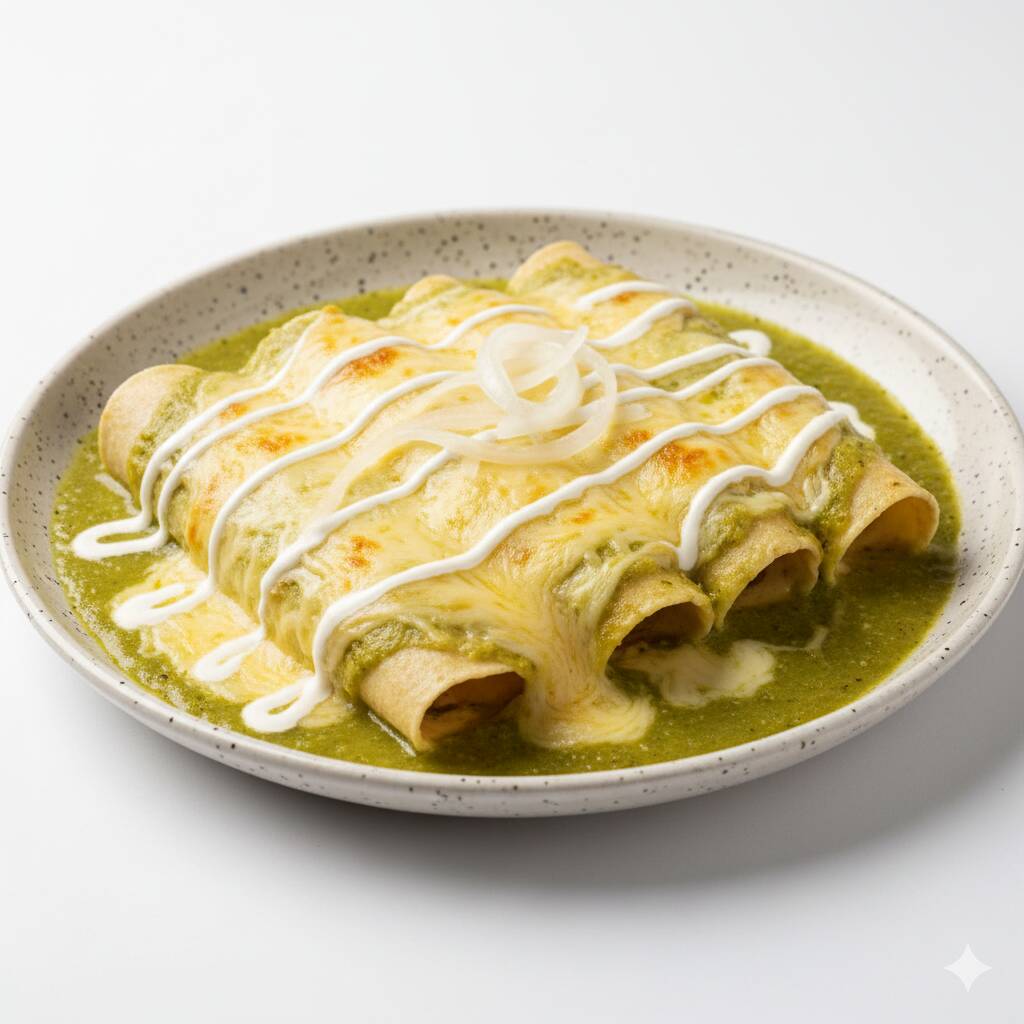 Tortillas de maiz rellenas a tu eleccion,bañanadas en una salsa verde cremosa gratinadas con queso gouda, acompañadas de frijoles.