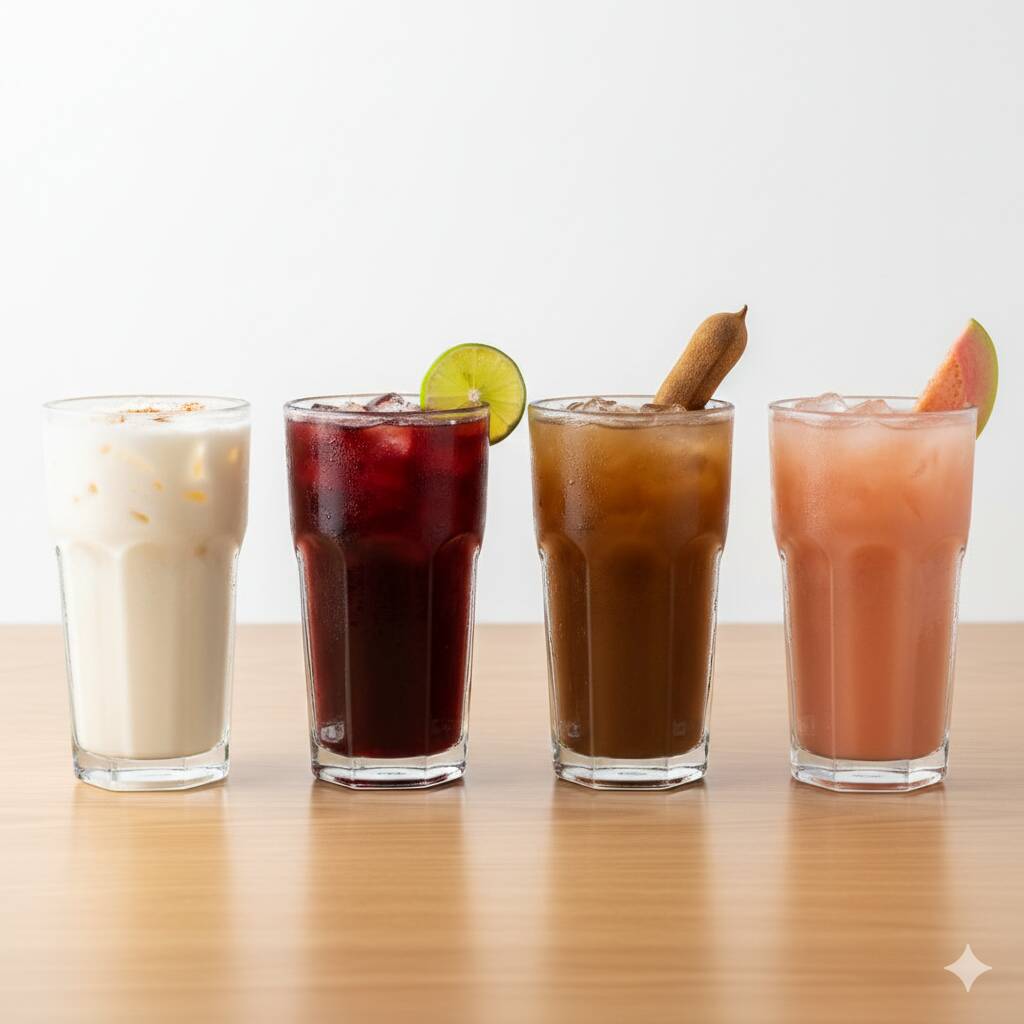 Deliciosas aguas frescas de horchata, jamaica, tamarindo o guayaba.