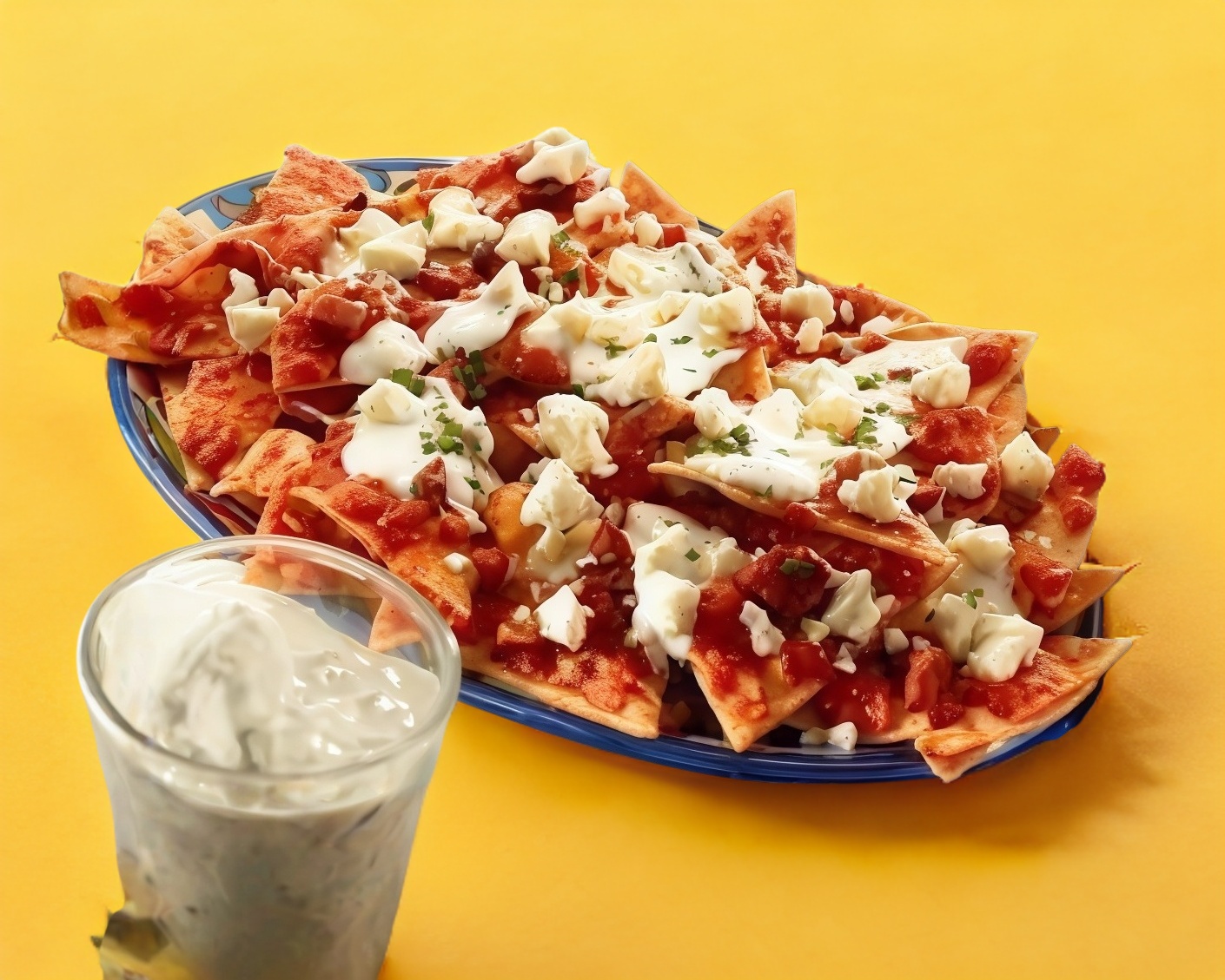 Tortilla de maiz crujiente con frijoles refritos y guisado encima, complementada con lechuga, crema, queso y salsa picante.