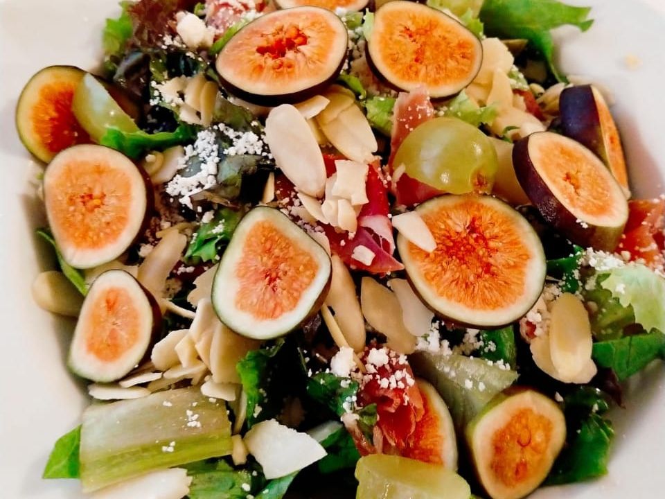 Mix de Lechugas, Uva, Queso de Cabra, Jamón Serrano, Almendra, Aderezo de Balsámico