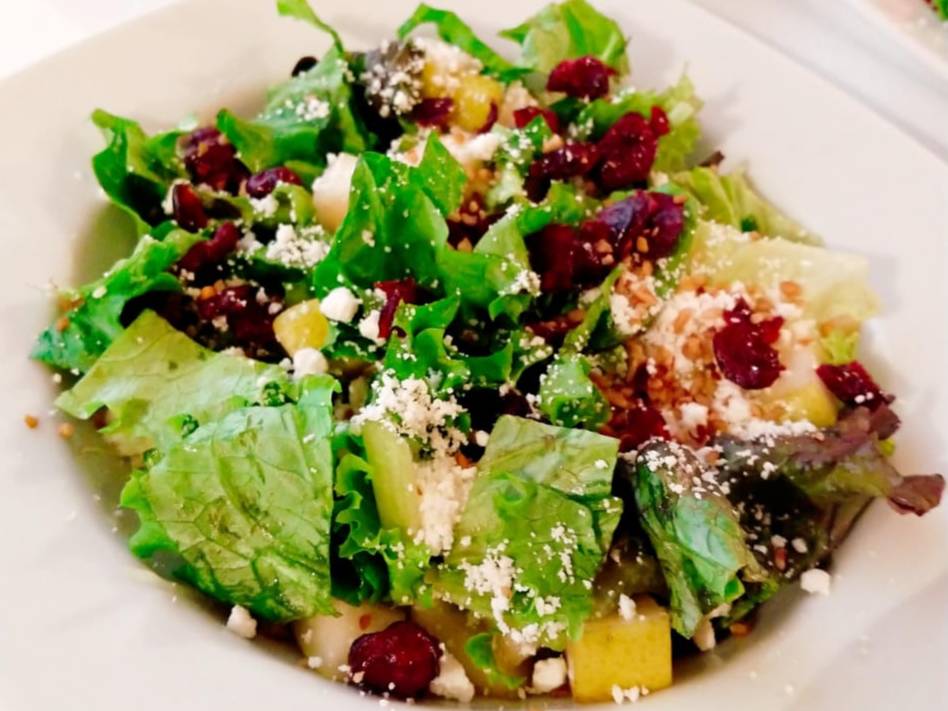 Mix de Lechugas, Pera, Arándanos Deshidratados, Queso de Cabra, Nuez , Aderezo de Miel y Mostaza.