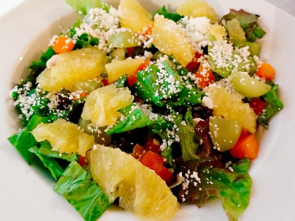 Naranja o cítrico de temporada, uva, pimiento, queso de cabra, ajonjolí caramelizado, aderezo de miel y mostaza