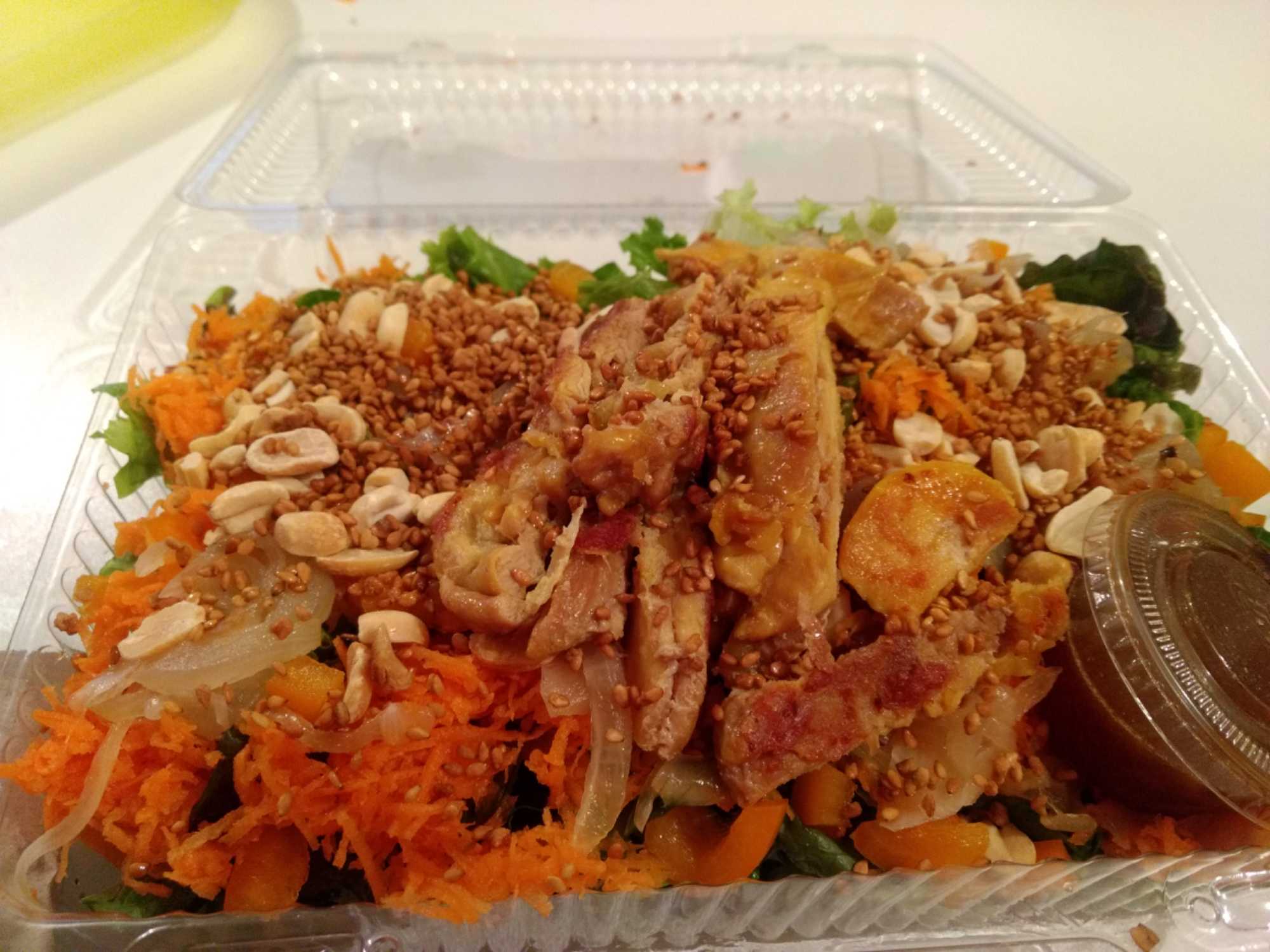 Mix de Lechugas Cacahuate Ajonjolí Fajitas de Pollo Cebolla Caramelizada, Zanahoria y Aderezo Teriyaki