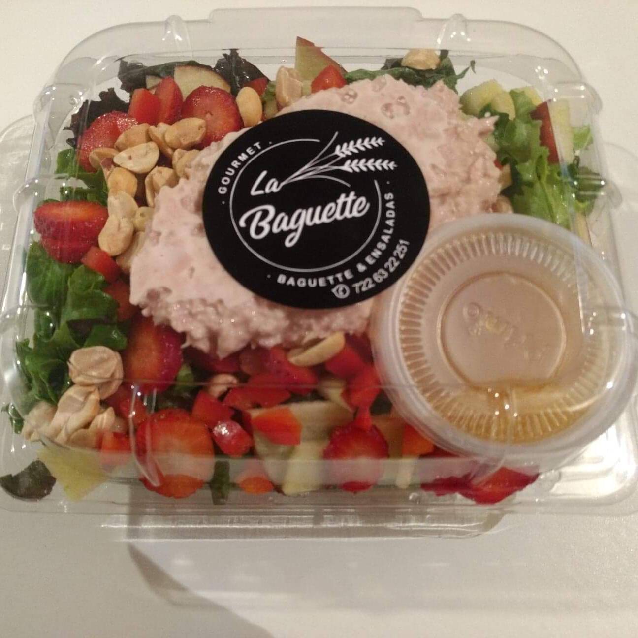 Mix de luchugas, atún, fresa, manzana, cacahuate, pimiento morrón, aderezo griego