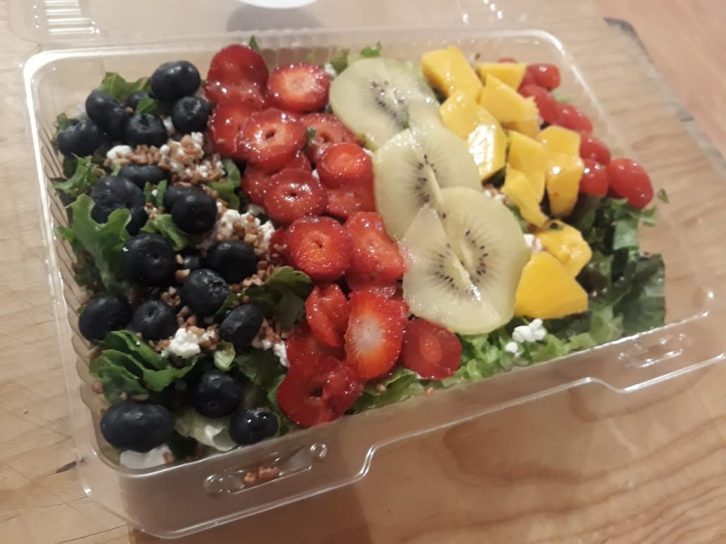 Mix de Lechugas, Mango o Fruta de Temporada, Kiwi, Fresa, Arándanos, Pimiento,Queso de Cabra, Nuez , Aderezo de Miel y Mostaza .