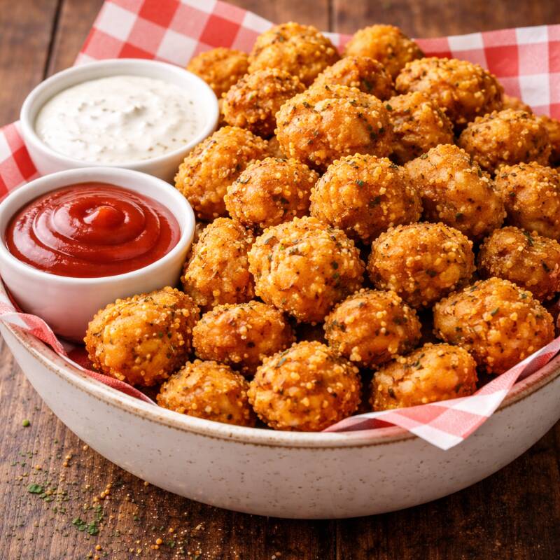 Bowl de palomitas de pollo sazonadas acompañadas de salsa y catsup.