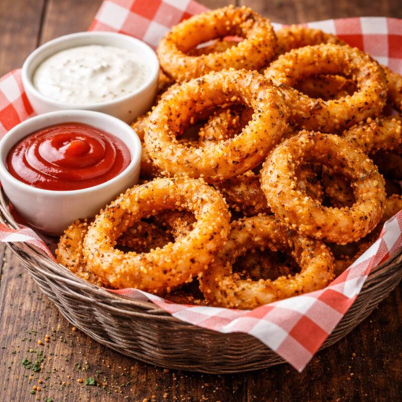 Orden de aros de cebolla crujientes sazonados, acompañados de aderezo ranch.