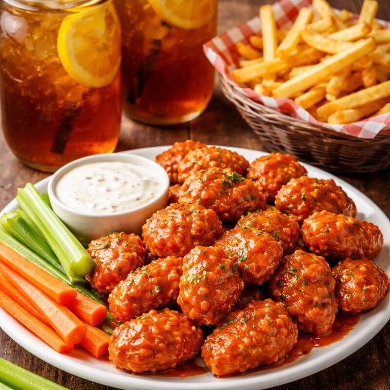 500g de boneless bañados en salsa a elegir, acompañados de aderezo ranch, orden de papas fritas, y dos bebidas (té helado).