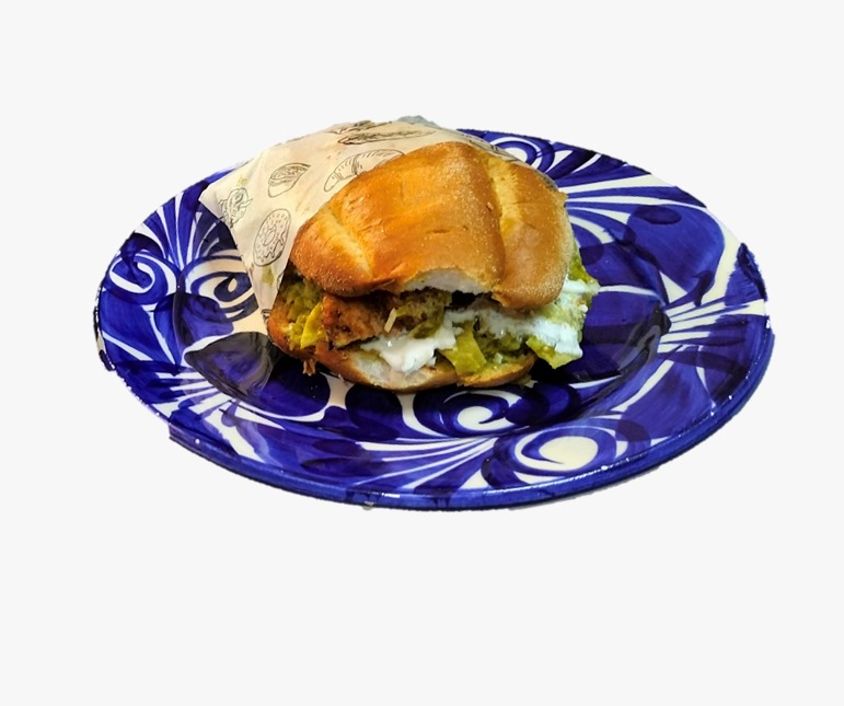 Delicioso sandwich de pan multigrano con pechuga empanizada, huevo estrellado, salchicha, jamón, queso oaxaca, cebolla, Jitomate, Aguacate, chiles en vinagre, lechuga..