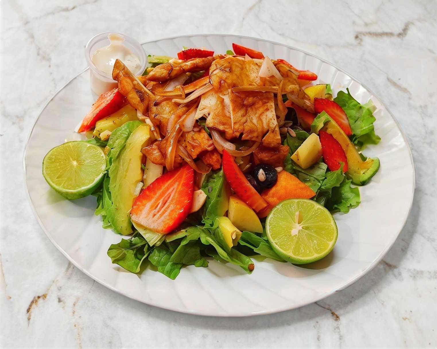 Ensalada de lechuga con mango, manzana, aguacate, frutos secos, fresas, adhereso mil islas y pechuga asada o empanizada