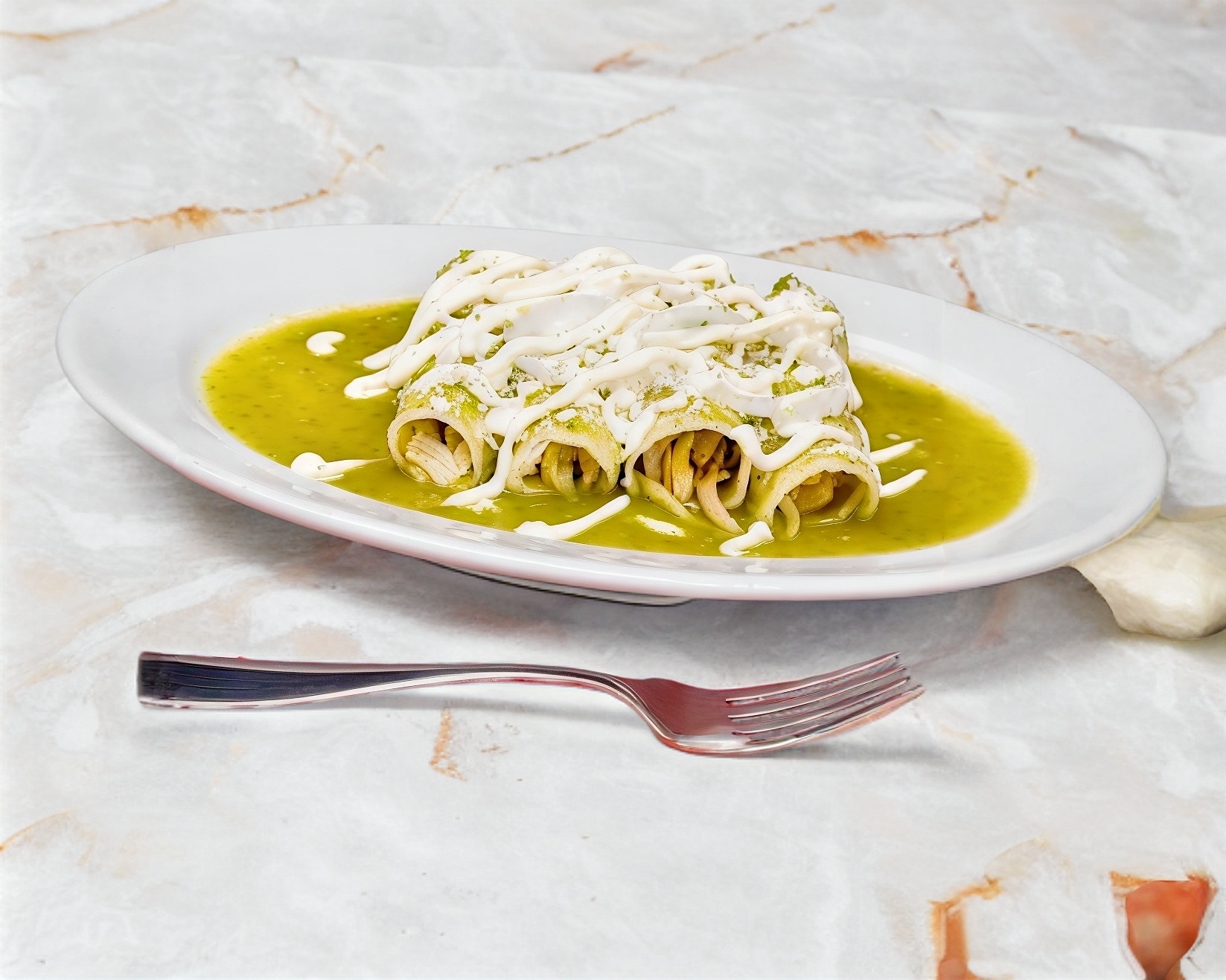 4 rollos de tortilla, rellenas de pollo, bañadas en salsa verde, decoradas de cilantro, crema, queso y huevo duro.