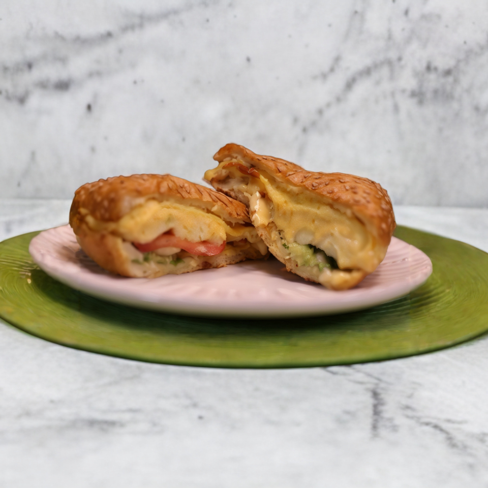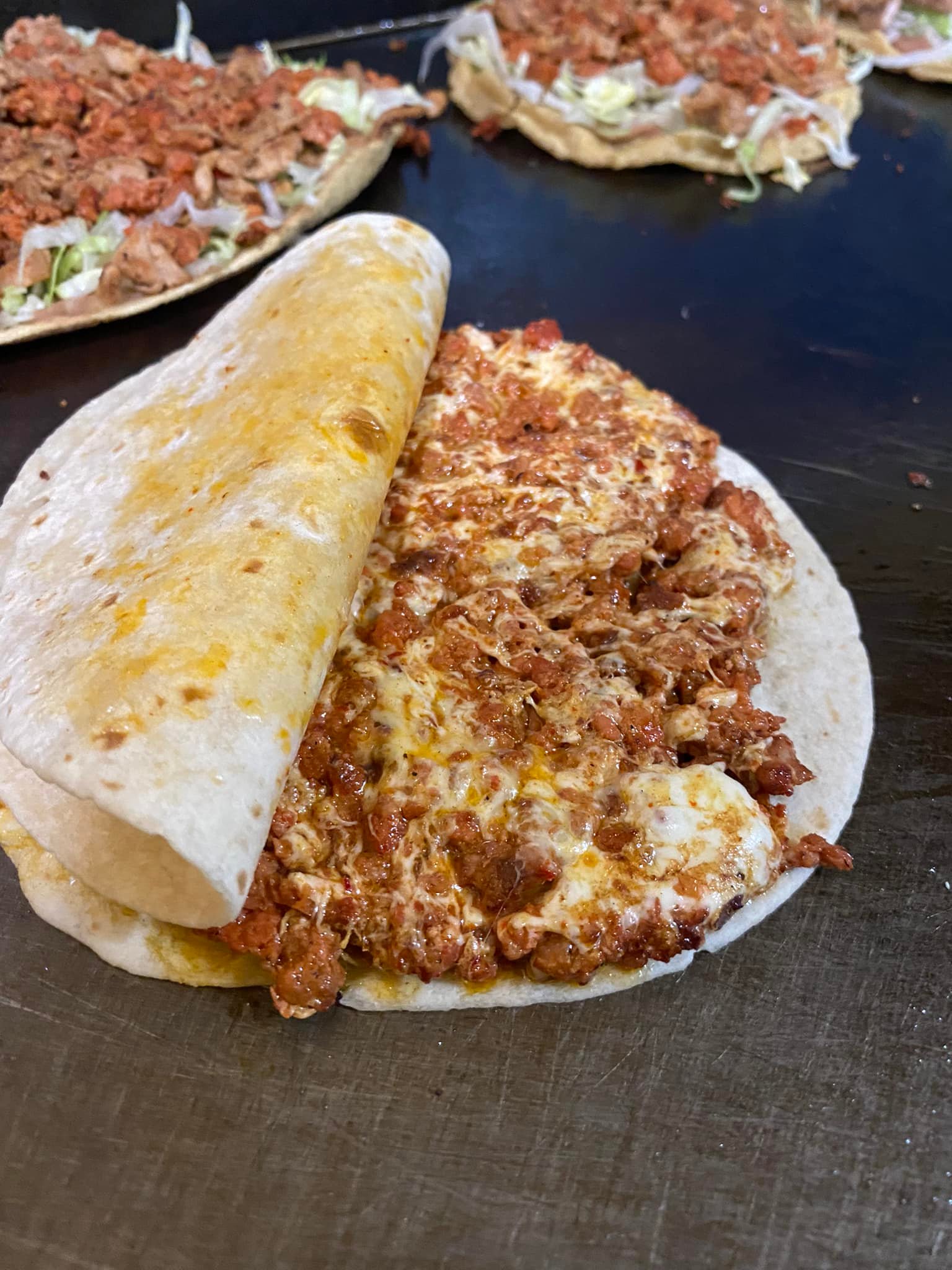 Tortilla de harina, queso manchego, queso oaxaca, jamón y tocino.