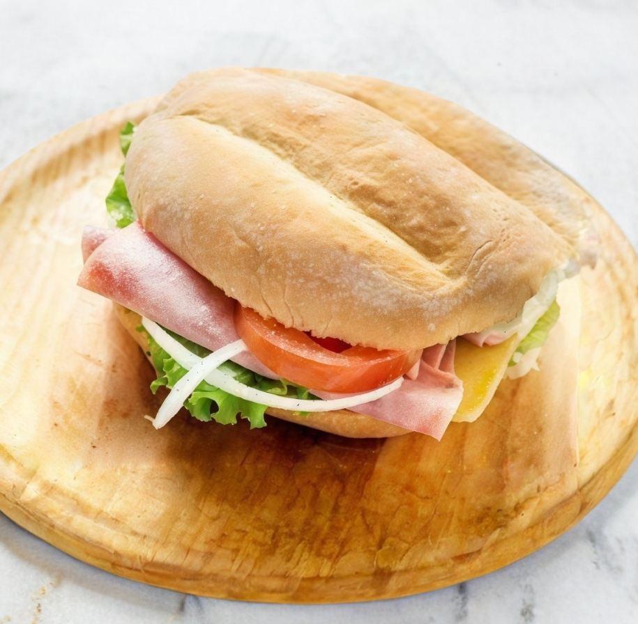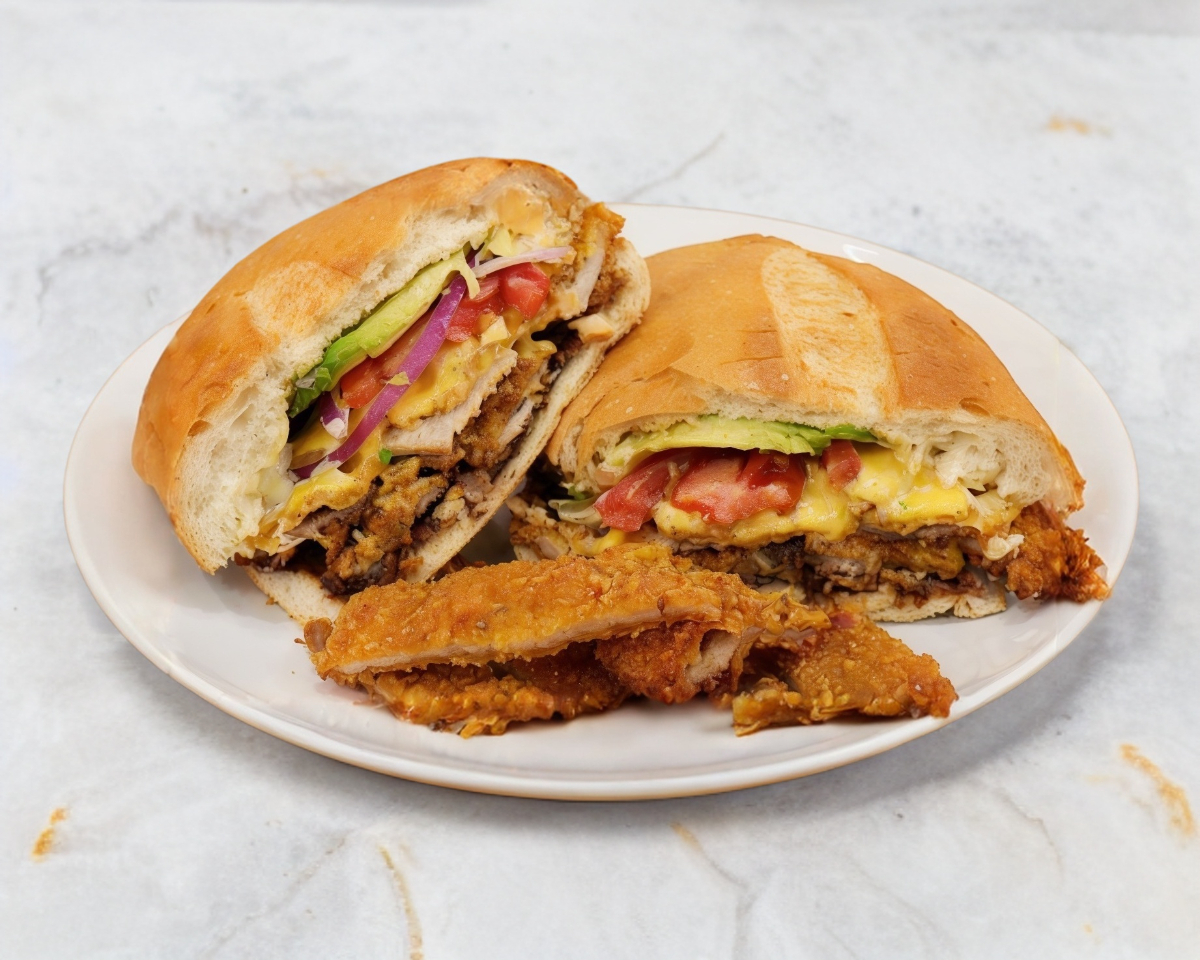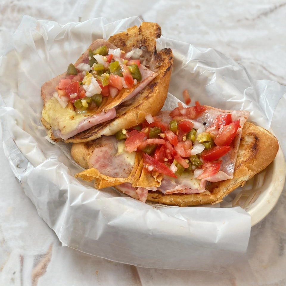 Jamón, queso amarillo, tocino, pollo, lechuga, jitomate y cebolla.