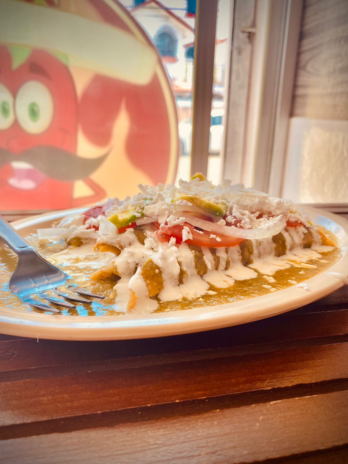 Orden de 3 flautitas de pollo ahogadas en salsa verde acompañadas de jitomate, aguacate, cebolla morada y crema.